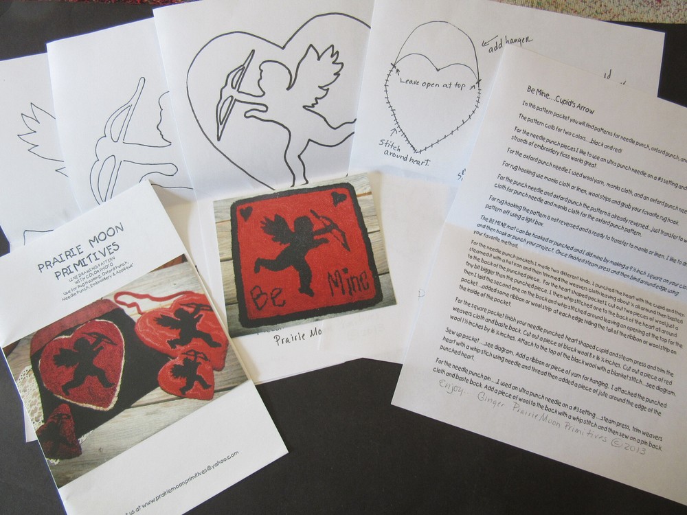 Prairie Moon Primitives Punchneedle Embroidery Pattern dated 2013 "Be Mine....Cupid's Arrow" Approx. finished size of design is 7" x 7" Includes paper design to trace & instructions only No other supplies included Many of these older patterns are out of print now