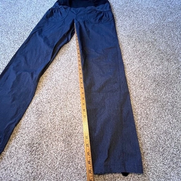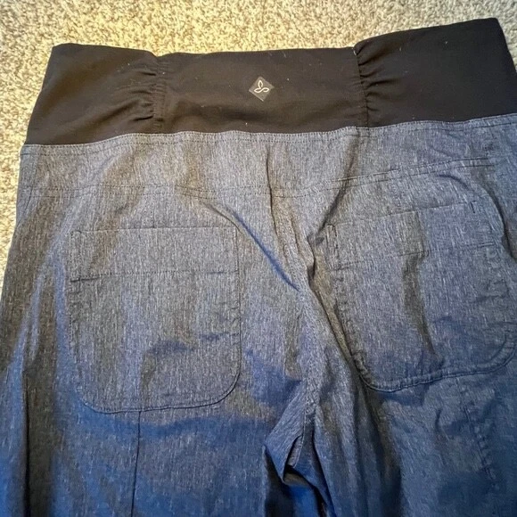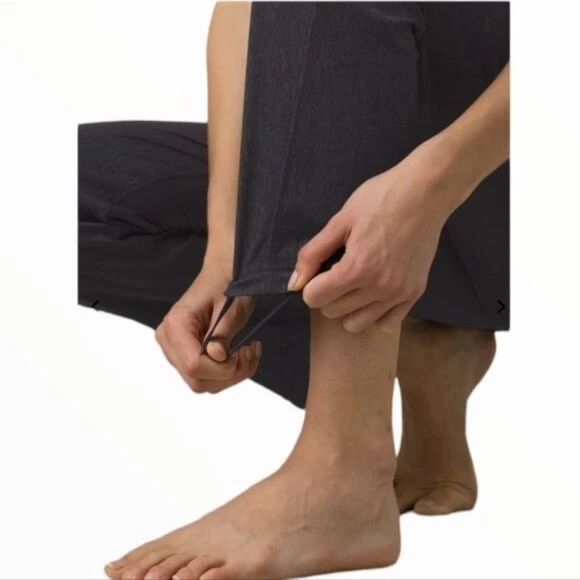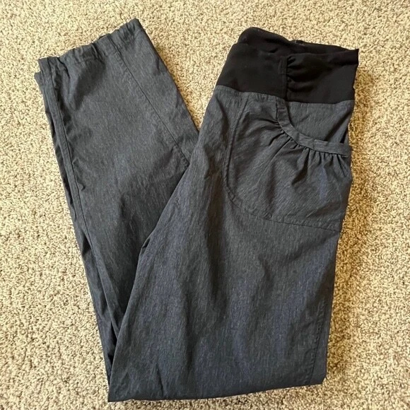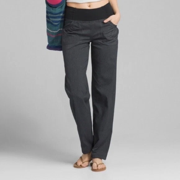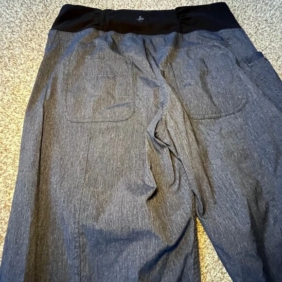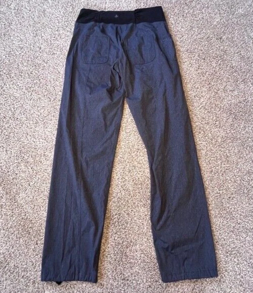 medium Performance Summit Pants by PrAna Features: Straight Leg with Adjustable Strap at the Hem Mid Rise Gray Color Called Charcoal Heather Solid Print 4 Pocket Style Pull On Closure Stretch Soft Shell Fabric A