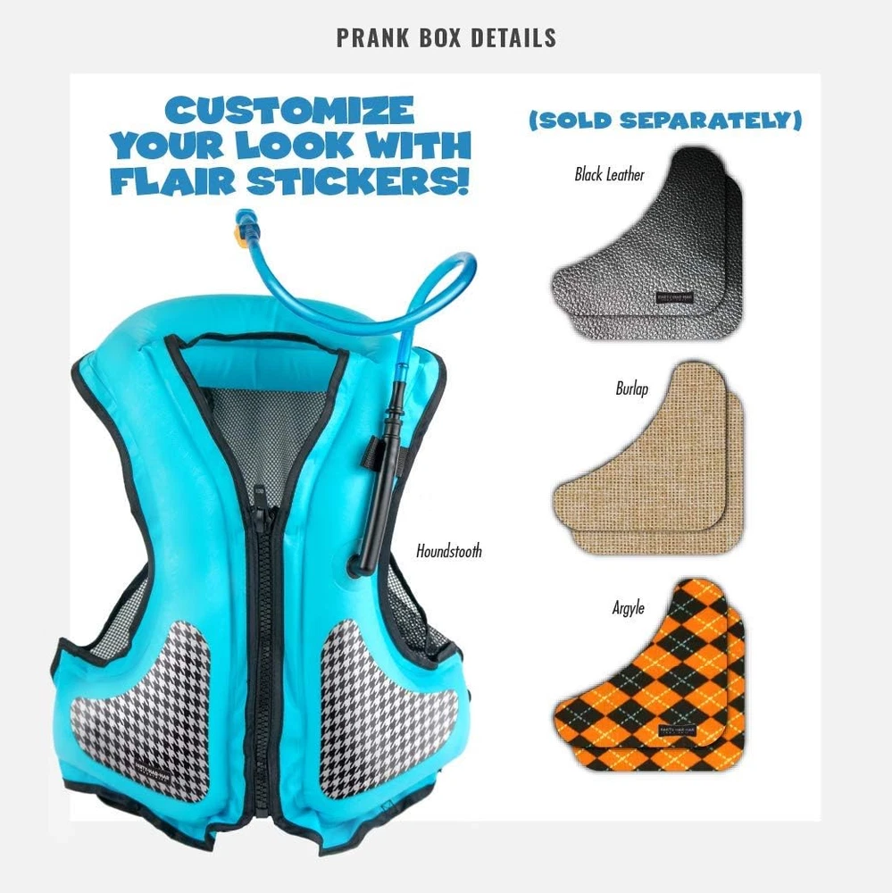 Liquor Vest Prank Gift Box, Wrap Your Real Present in a Funny Authentic Prank-O Gag Present Box | Novelty Gifting Box for Pranksters PRANK GIFT BOXES at first appear to contain bizarre products from ridiculous companies. Simply, “Put Your Real Present Inside the Joke Box" and try to keep a straight face as you watch your friends & loved ones attempt to remain gracious while thanking you for the present. Then watch them explode with laughter when they discover their actual stuff inside and realize they’ve been pranked. (DOES NOT INCLUDE ACTUAL LIQUOR VEST) TAKE YOUR GIFT GIVING TO THE NEXT LEVEL WITH THE ORIGINAL GAG GIFT BOX. We pride ourselves on our incredible attention to detail. We’ve thought of everything from the ridiculous fictional product itself, to the hilarious images and detailed product description. This box will have any recipient truly convinced that you just gave them the most bizarre gift of all time... but it's just a fake present box ADD THE GIFT OF LAUGHTER to the party with this quirky and fun twist on the timeless tradition of fun gag gift giving for boyfriend, girlfriend, mom, dad or kids. Whether you consider your funny gift giving skills to be amazing or not, wrapping any gift inside a Prank Pack adds an extra layer of fun and enjoyment that will have everyone in the room laughing HIGH QUALITY GIFT PRANK BOXES made in the USA of 100% recyclable cardboard. Our boxes ship flat and are easy to assemble – no glue or extra steps required. At 11.25” x 9” x 3.25” they are the perfect size for almost all funny gag gifts! Made in the U.S.A. PLEASE NOTE. This is an EMPTY prank GIFT BOX - QUARANTINE FUN Product Description Become the life of the party by disguising your present inside one of our gift boxes! Shop witty options for baby showers, birthdays, Christmas, or any other special occasion to bring a whole new level of fun to the gift-giving experience. They’re the boxes for screamingly funny, hilariously awful, but scarily plausible products that don’t really exist. The photography, typography and layout of these boxes are perfect. I mean, they look exactly like the cheesiest products you’d buy from TV infomercials. Anyway, the point is that you put people’s real presents inside the Empty Prank Pack boxes . Then, when they unwrap their gifts, you get that delicious moment of watching their faces as they struggle to be tactful. They think you’ve just given them the all-time turkey of presents. Once they figure out that it’s just a satirical prank, there’s even more laughter — and then gratitude for the much more thoughtful present you’ve stashed inside. Bring the humor to every party with our one of a kind prank gift boxes. They are more than just an empty box, but a moment to experience fun and laughter with the entire family. SIZE OF BOX Each Prank Pack gift box measures: 11.25”x 9”x 3.25”. (About the size of a giant phone book.) Fit any standard size present in our hilarious, witty, empty boxes. Easy to assemble, lightweight, realistic experience for the entire family or friend group. HOW IT WORKS Stash the real presents inside the empty Prank Pack boxes. Then, when they unwrap their gifts, you get that delicious moment of watching their faces as they struggle to be tactful. They might think they're really opening a junk drawer kit, or a snack hat, when in reality, their nice gift is inside. PRANKED Once the victim opens the box they will see two bright yellow tabs that read, “Prank You!” & “ Don’t get too excited, your real gift is inside.” Enjoy pranking your friends, while also gifting them a real, nice gift too! Create an experience for the whole family with a fun, goofy surprise. OUR MISSION: CONFUSE & AMUSE At Prank-O we are dedicated to bringing a little deception and a lot of laughs to the gift-giving experience. After all, there is no greater gift than laughter… except for one of those remote-control quadcopter things.