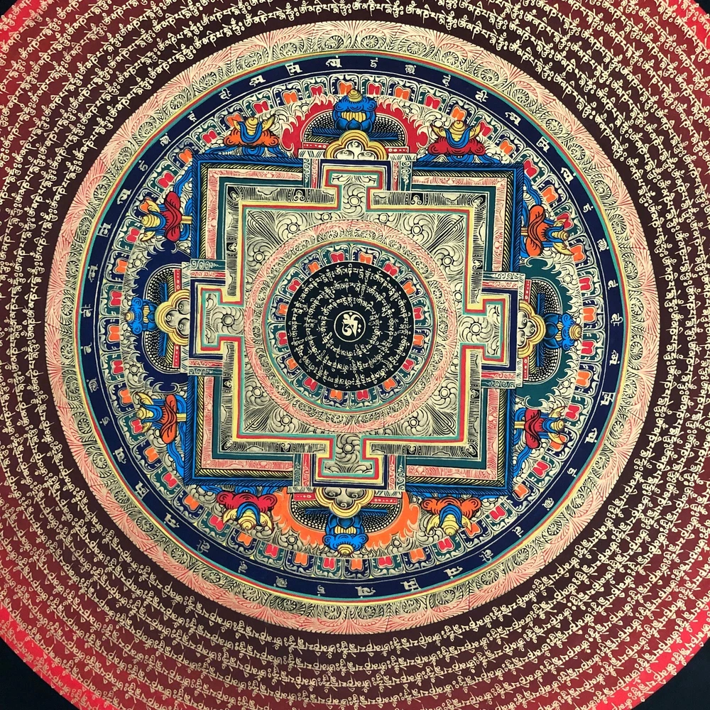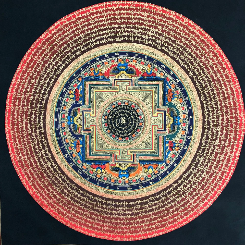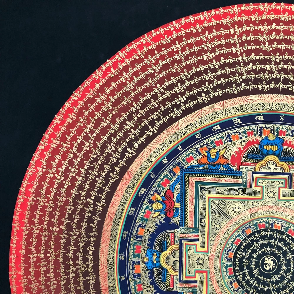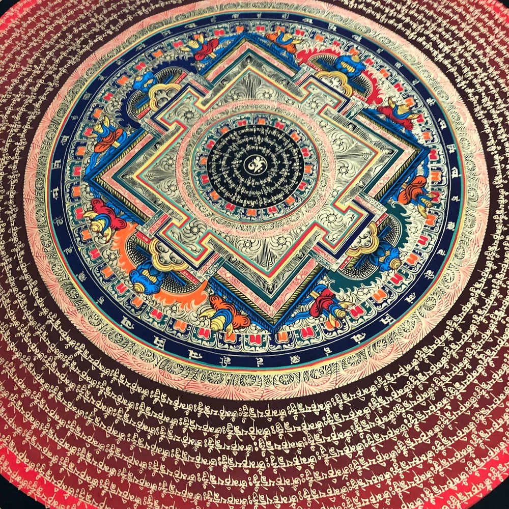 Namaste and Welcome to my Gallery!!! All of the paintings and arts in my gallery are originally handmade and hand-painted by my family members and other local artists who have been practicing their craft for over two decades. My father is Master Artists Nepal with an experience of more than four decades; you can see some of his work in this Gallery. Also you can see some of the beautiful and soulful artwork of talented local artists from Himalayas. ~~Mantra Mandala Thangka Art~~ In the painting you can see that outer layer is the fire meaning that all your negative emotions such as hatred, anger will be burnt. And in the middle Double Bajra is surrounded by prayer "Om Mani Padme Hum". Mantra here refers to the recitation of the essence words of the particular rituals of deities. When the word mantra is separated into two segments, it reveals the inner menning of salvaging one's mind from conceptualization, concept and fear. " Man " in Sanskrit means mind, and " tra " in Sanskrit means to protect. " Om Mani Padme Hum " the six syllables, Om Mani Padme Hum , mean that in dependence on the practice of a path which is an indivisible union of method and wisdom, you can transform your impure body, speech, and mind into the pure exalted body, speech, and mind of a Buddha. [Size = 81cm x 81cm] Material Used: • Cotton Canvas • Natural Pigments and colors • Gold leaf ~Excellent for meditation or home/office decor, ~Tibetan Yoga Wall Art ~Genuine 100% hand-painted from Himalayas Please feel free to contact me if you have any question regarding the painting.