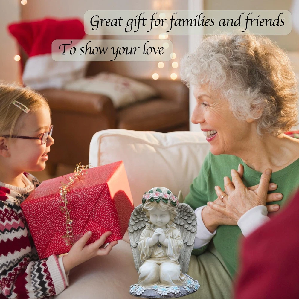 【 Beautiful Angel Garden Statues】This angel garden decoration is a unique design,that a kneeing angel with wings is praying ,The crafted design and workmanship make her very beautiful.And it makes a very peaceful and fairy feeling.Imagine how harmonious it would be to have such a lovely angel in your home. 【Durable and Waterproof】The solar angle sculpture is made of high quality resin, which is durable and weather resistant. The whole product is IP44 waterproof, So you can place it outside in any weather conditions. 【Peffect Size】The statues is in perfect size,measured 8.07in*6.10in*5.5in,and can be used in a variety of scenes for decoration, whether it is placed indoors or outdoors on the lawn, patio, balcony and other places, it will become a focal point of your home! 【Easy To Use】This garden decoration is very easy to use, just press the switch when you use it for the first time, Then place it somewhere that can get the sunshine,the will automatically charge during the day and light up at night.When comes night the warm yellow light emanates from the angel's chest and wings, making her look very warm. 【A Great Garden Gift】This Angel Praying garden Statue is a perfect gift choice for Mom,Grandma,Wife,Daughter,Sister,Aunt,Girlfriend when Birthday Mother's Day, Father's Day,Thanksgiving Day,Valentine's Day,Christmas and ohter occasions.