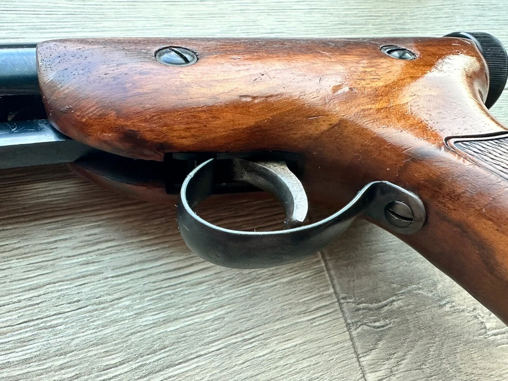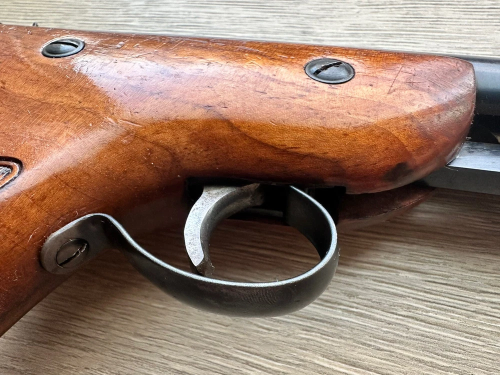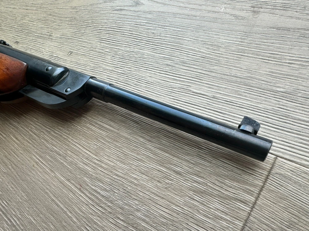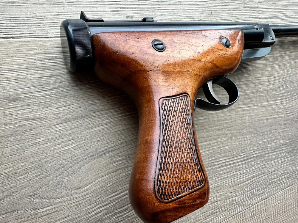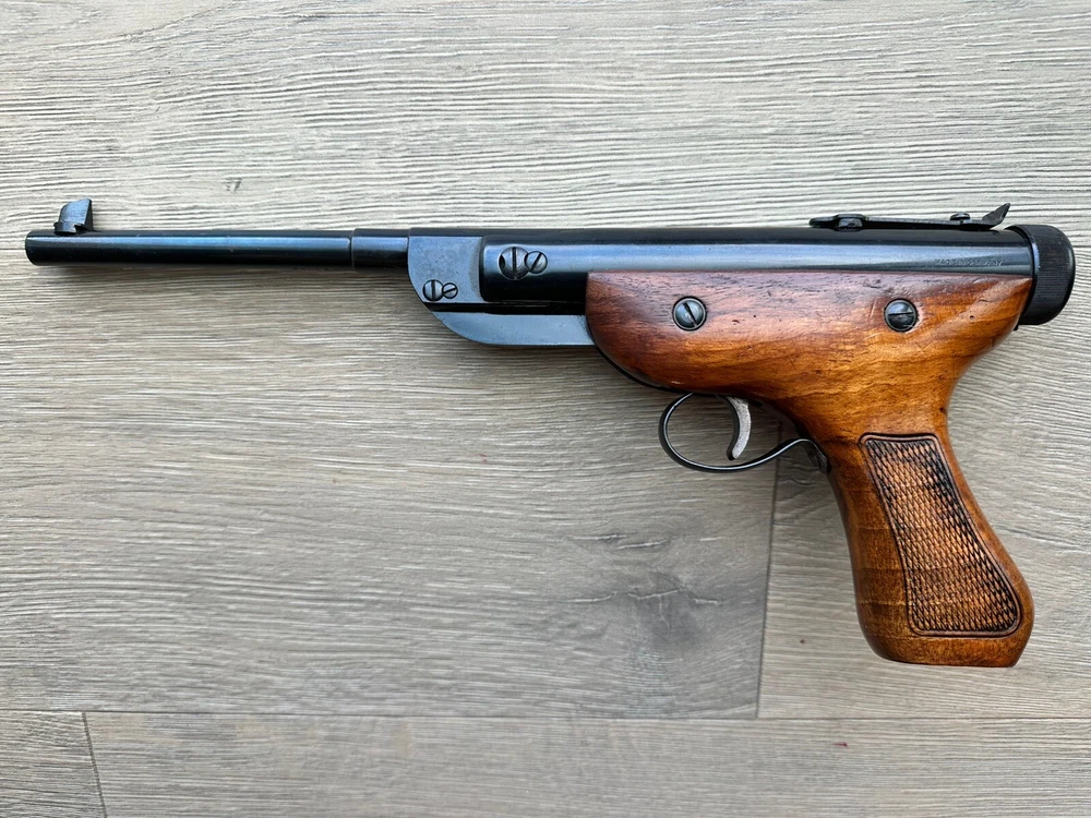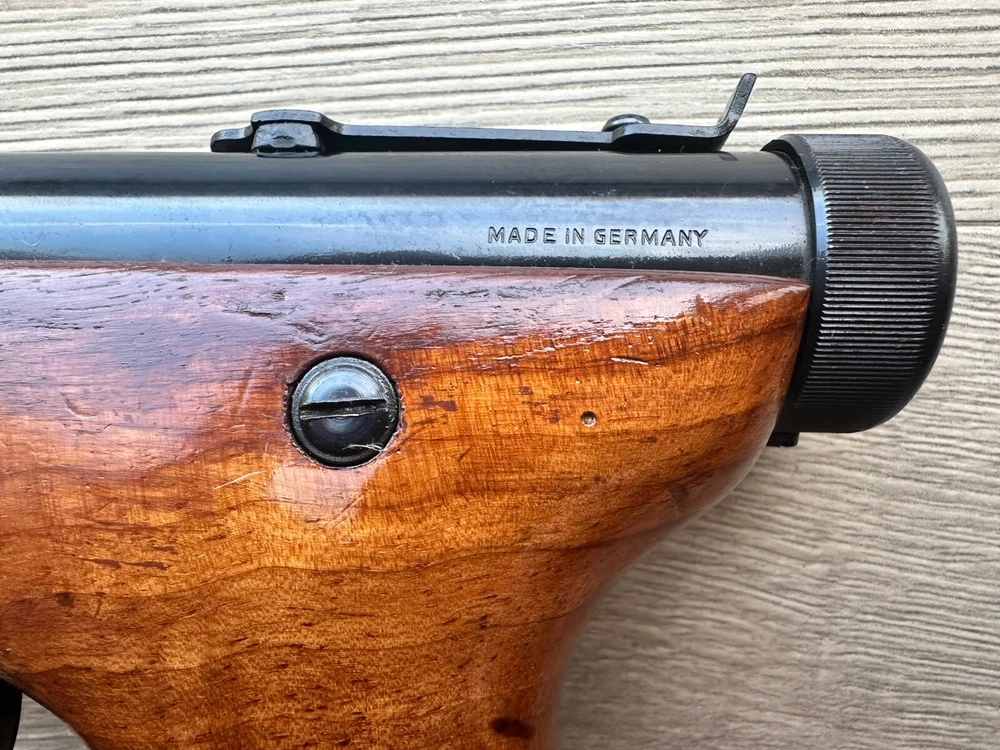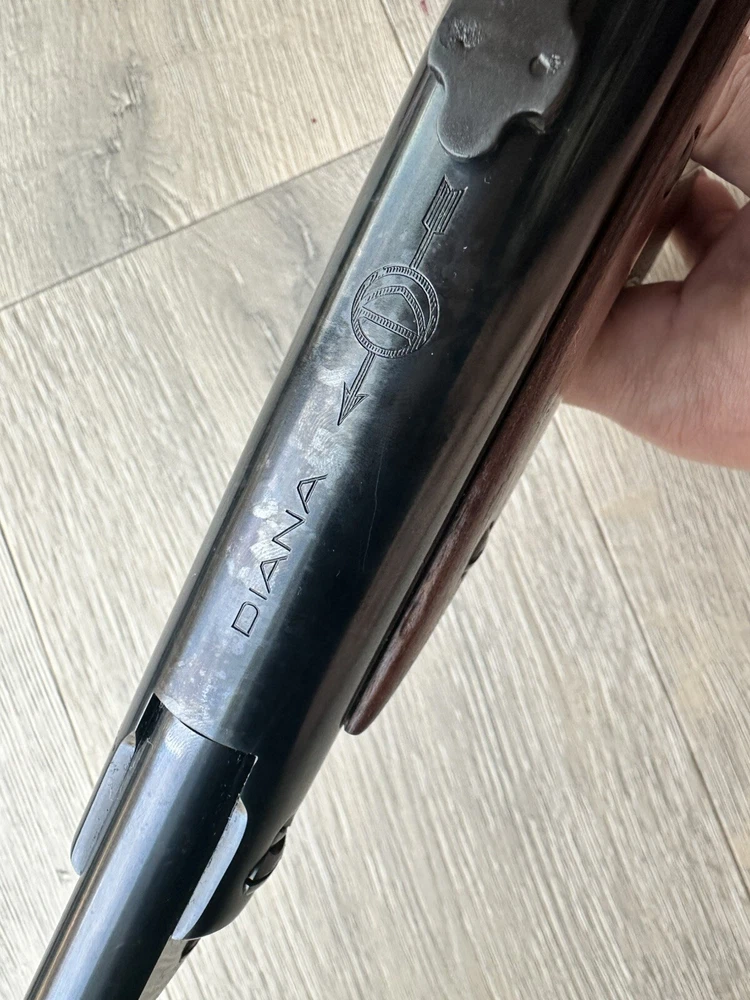 Great Condition! A MGR Diana Model No 5 .177 Calibre Air Pistol manufactured by Mayer and Grammelspacher, Rastatt, Germany Circa 1931 -1940. A good example of this Pre WWII German manufactured Air Pistol. The blueing on the barrel and action is in good order retaining most of its original finish fading on the barrel where it has been subject to more usage. The markings on the cylinder detail ‘DIANA’ with the ‘ringed ‘D’ with the arrow through it’ lenghtwise with ‘MADE IN GERMANY’ on the left side of the air chamber. The barrel is stamped to the underside ‘CAL 4.5 M/M’ The walnut stock is in good condition with no splits it does have mark from usage but nothing serious. The pistol is fitted with its correct adjustable rear sight and post front sight. It cocks and fires with no issues. A good example of this classic Pre WWII manufactured German Air Pistol. This listing complies with eBay’s air gun guidelines found here and I will only sell and ship air guns to buyers in jurisdictions where permitted by applicable laws http://pages.ebay.com/help/policies/firearms-weapons-knives.html