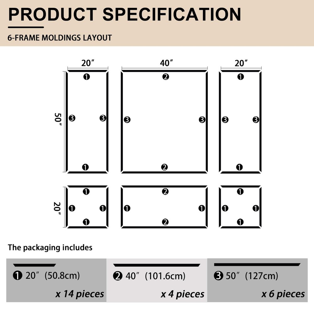 Pre-Cut Accent Wall Molding Trim Kit, 6 Frames Premade Wainscoting Panels for Interior Decoration, Ready to Assemble Chair Rail Moulding Product Details Size Name: 6-Frame, Section width: 1.4“ Color: White Brand: Hungbak MPN: PS-4 UPC: Does not apply EAN: Does not apply Manufacturer: Hungbak Part Number: PS-4 Item Weight: 7.19 pounds Package Dimensions: 52.3 x 6.5 x 4 inches Country of Origin: China Size: 6-Frame, Section width: 1.4“ Color: White Finish: Finished Material: Polymer Batteries Included?: No Batteries Required?: No Date First Available: November 6, 2024 Kit Contents: You'll receive pre-cut wall molding kits, with the 3-frame combo including 18 pieces or the 6-frame combo featuring 24 pieces Durable Material: Our molding kits are crafted from high-quality polystyrene, offering superior strength and durability. This material is superior to traditional wood, makes the panels resistant to scratches, cracks, and moisture, ensuring long-lasting beauty Effortless Assembly: Our DIY molding kits simplify your decor project, with pre-cut pieces that are easy to install, regardless of your skill level. No cutting or aligning is required, just apply structural glue Versatile Design: Add depth and sophistication to any room with our prefabricated wall molding kit. Customize the look by adjusting spacing and mixing sizes to create a personalized interior design Universal Use: Our trim enhances the elegance of various rooms, from bedrooms to hallways. It simplifies the decoration process, enabling you to achieve a stylish and refined home ambiance