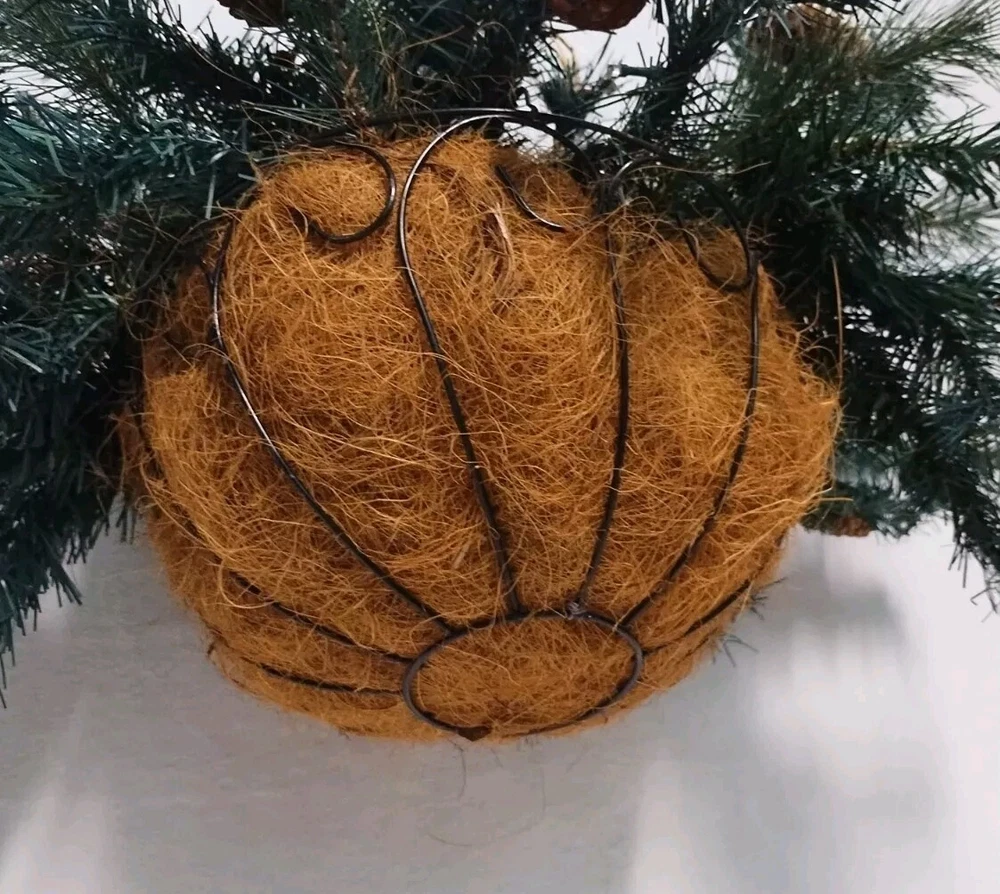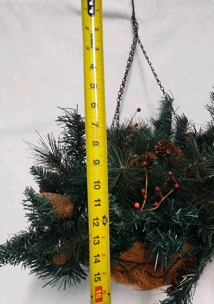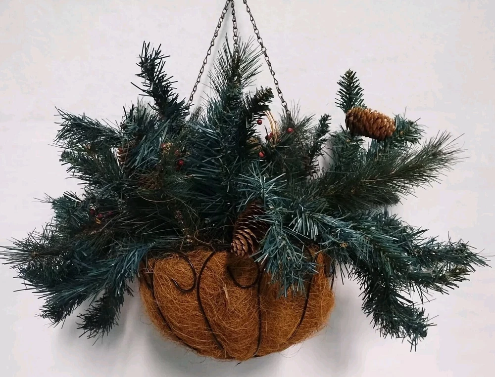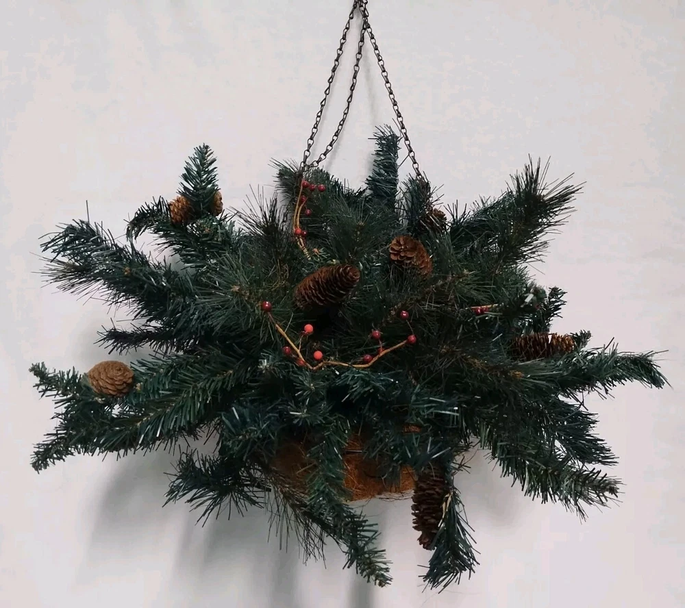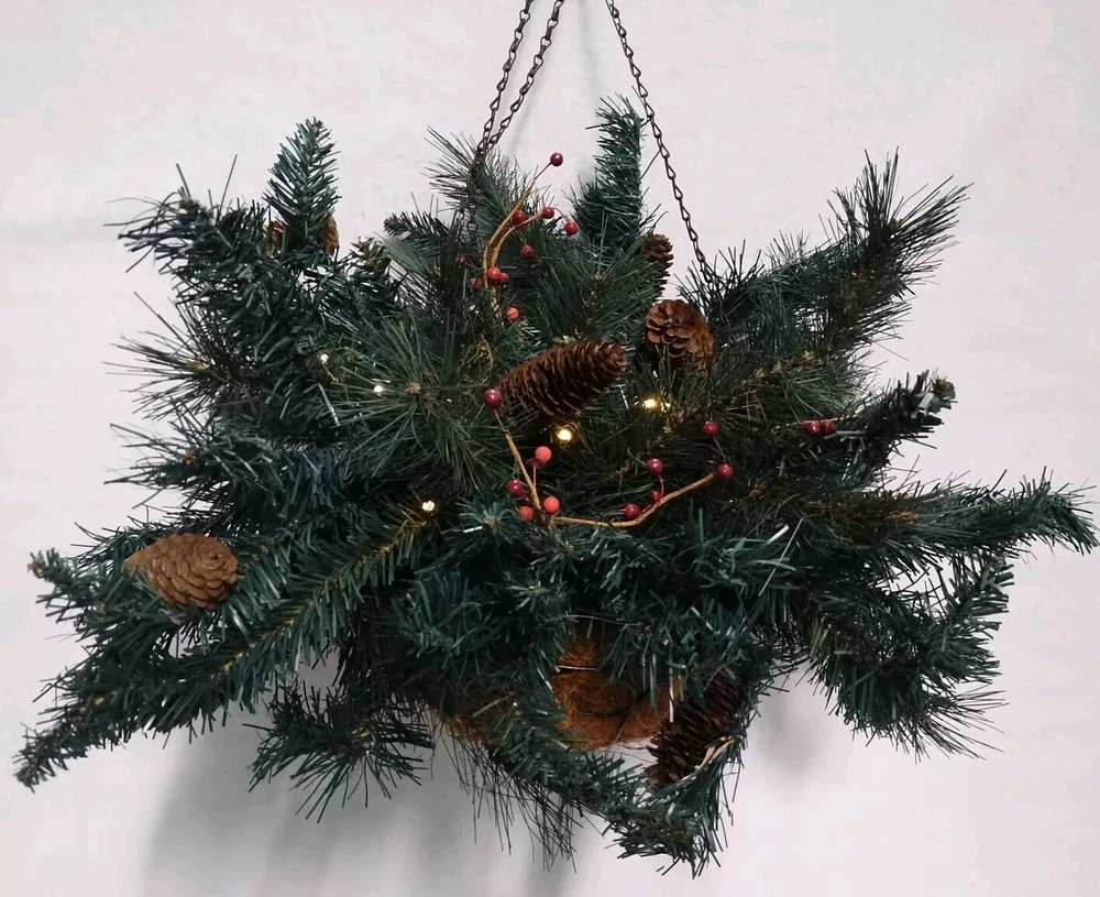 The "Pre-Lit Artificial Christmas Hanging Basket", designed for Christmas decorations. It features a lighted evergreen plant that is battery-operated with a timer function, adding a festive touch to any space. This hanging decoration is perfect for creating a cozy and inviting atmosphere during the holiday season, while eliminating the need for manual operation due to its timer feature.