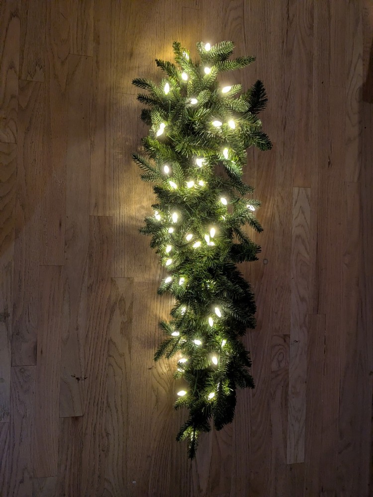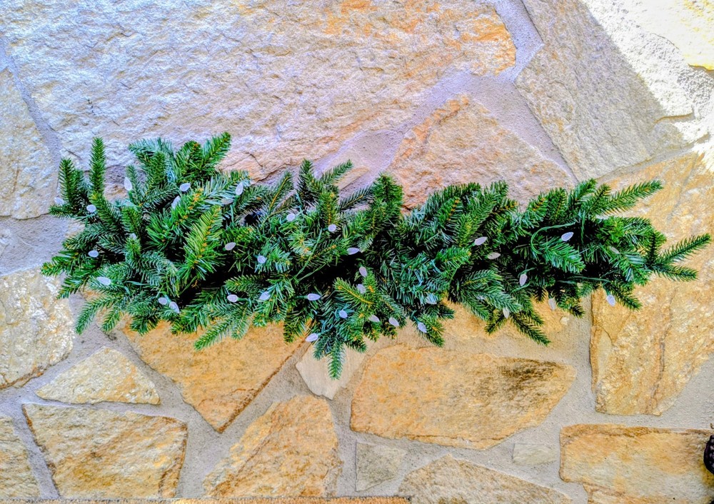 Open box, only used to test for pictures, no broken, and no missing pieces. 3ft long. Long lasting artificial construction. Uses 4AA batteries 9 (not included) by battery pack for easy portability. The garland alternates lights from soft white to red/green/blue multicolored blinking and flashing LED lights.. 10LFB