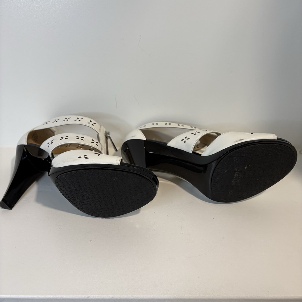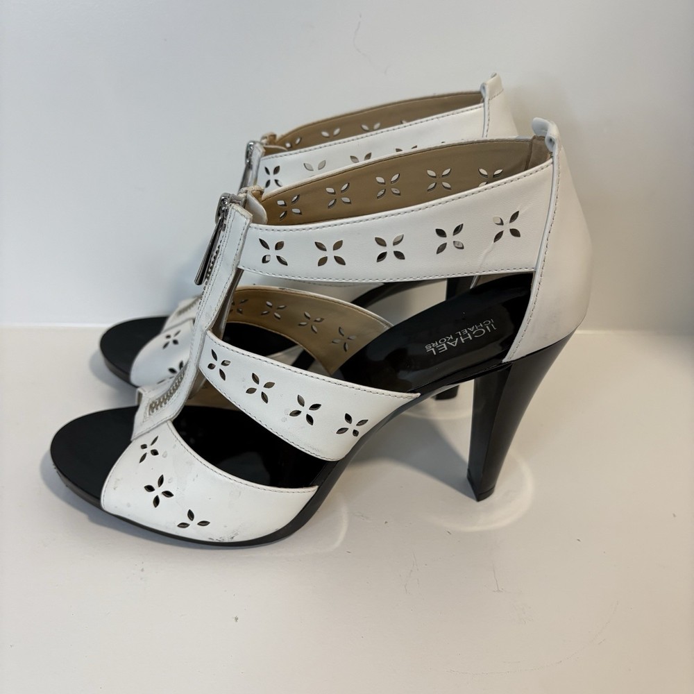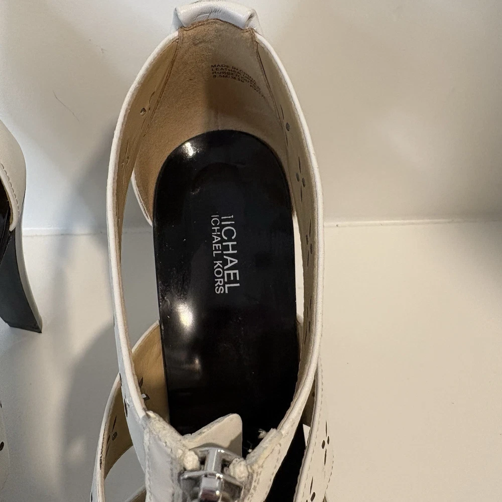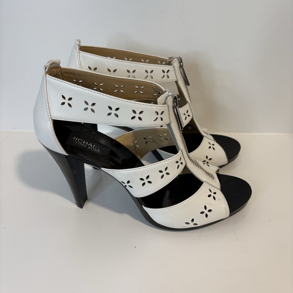 Elevate your footwear game with these elegant MICHAEL Michael Kors pump heels. Presented in a crisp white, these size 8 pumps are the embodiment of sophistication, perfect for a variety of occasions from workwear to cocktail parties, or even weddings. Their ultra-high heel, measuring 4 inches or more, offers a poised posture and a fashionable edge. The design features a seamless zipper closure, ensuring a comfortable fit while adding a sleek accent to the shoe's silhouette. These heels are a chic addition to any wardrobe, seamlessly blending style with functionality.