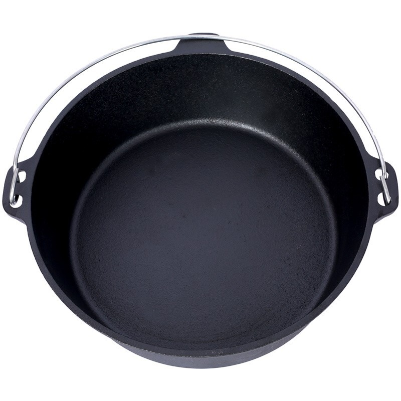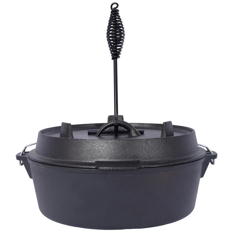 Features and Details: Crafted to endure the harshest of outdoor conditions, this is a camping essential. Whether you're simmering a hearty stew over an open campfire, baking a delicious cobbler in hot coals, or slow-cooking a savory meal during your wilderness escapades, this Dutch oven's excellent heat retention and even distribution ensure culinary success every time. It's the ultimate companion for creating unforgettable camping feasts. The Dutch oven's ingeniously designed lid is a true marvel of functionality. Fitted with sturdy legs, it seamlessly transforms into a skillet or griddle, unlocking a whole new realm of culinary possibilities during your camping trips. Whether you're craving crispy bacon for breakfast, searing succulent steaks for dinner, or flipping fluffy pancakes under the open sky, this dual - purpose lid has you covered. Designed with convenience at its core, this cast iron Dutch oven features a robust built-in carrying handle, enabling you to effortlessly tote it from your vehicle to the campsite. Moreover, the oven can be securely suspended from a tripod stand on level surfaces, providing you with unparalleled flexibility in your cooking setup. That's why we include a specialized dutch oven lid lifter, engineered to ensure a secure and hassle - free experience when handling hot lids. This essential accessory minimizes the risk of burns and accidental spills, allowing you to confidently maneuver the lid while cooking. Specification: Color: Black Main Material: Iron Product Dimensions:10.6"L×11"W×6"H Product Weight (lbs.): 13.5