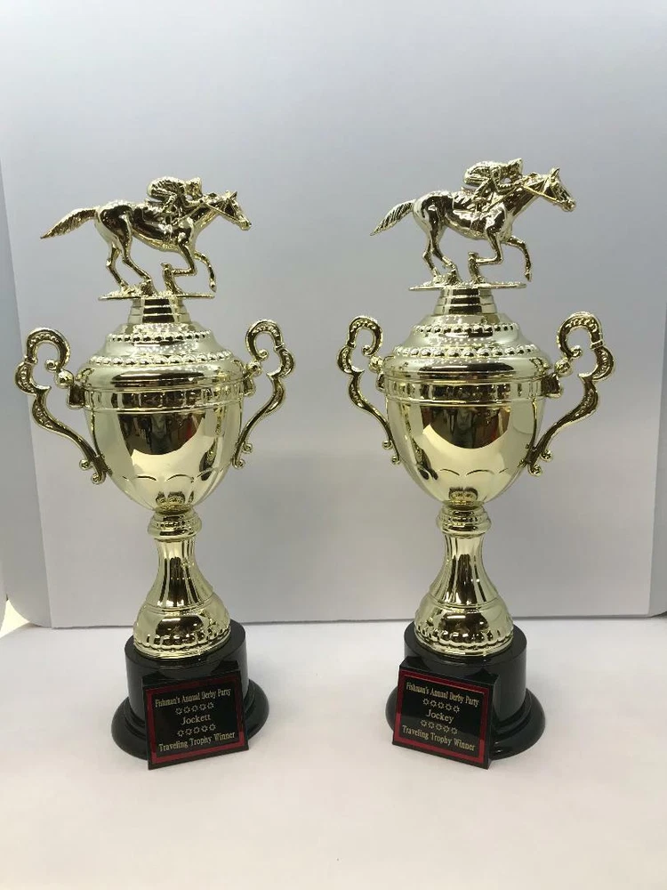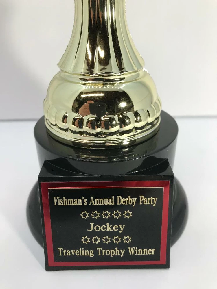 TROPHY FEATURES: PREAKNESSS STAKES / HORSE RACING PARTY AWARD!! BEST DRESSED LADY, GENT, COUPLE FIRST PLACE HORSE PICKER! TRAVELING TROPHY ETC.! TROPHY IS 14” “ TALL HEAVY RESIN *FREE CUSTOM ENGRAVING!* With felt bottom bump, foot pads to protect and prevent scratching furniture, table tops, etc. Custom Engraved 1.5"x 2.25" Black Brass Nameplate with Red Backing Plate! ATTENTION PLEASE! We do real diamond cutter engraving Not on plastic or laminate! This nameplate is black brass ! ALL ENGRAVING IS FREE! PLEASE VIEW MY FEEDBACK! During eBay checkout, on the view your purchase page, click on the message to seller area to add your personalization information you want engraved. PLEASE PUT the exact name/names And all text you want on each line of the engraved nameplate. (please double check the spelling) Thank You! Please # the lines! Here is a sample 1 st line THE MAGIC HATS 2 nd line 2011 3 rd line 8 BALL CHAMPIONS I am a Disabled American Veteran. I have been self employed and producing licensed sports plaques in New England since 1990. The quality of our product and workmanship are unsurpassed. If you would like a custom plaque made, or have any questions please email anytime. God Bless America, John For more sports plaques and memorabilia please view our other auctions. eBay - MRVITO34 eBay store Jva Sports Plaques Thank you and good luck! PLEASE DO NOT JUDGE TROPHIES BY SCAN. WE SHIP SEVEN DAYS A WEEK! ALL ORDERS RECIEVED BY NOON SHIP SAME DAY! WE SHIP 7 DAYS A WEEK! ALL ORDERS RECEIVED BY 12 NOON SHIP SAME DAY!