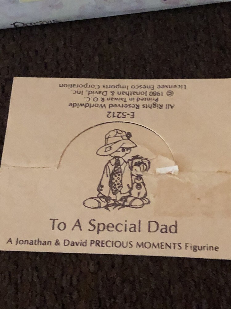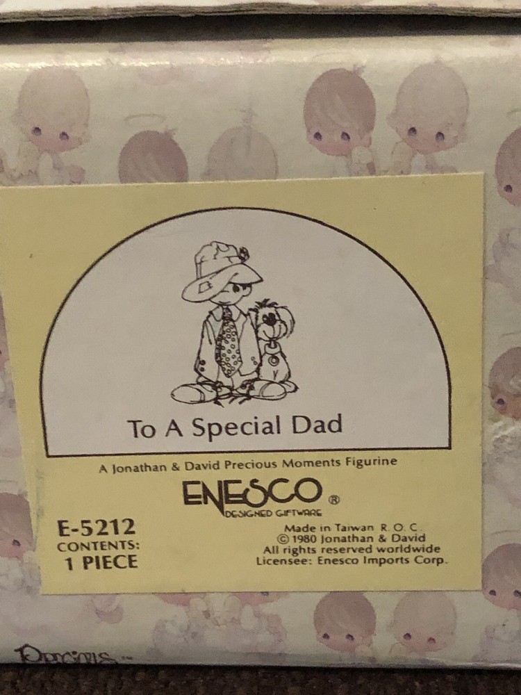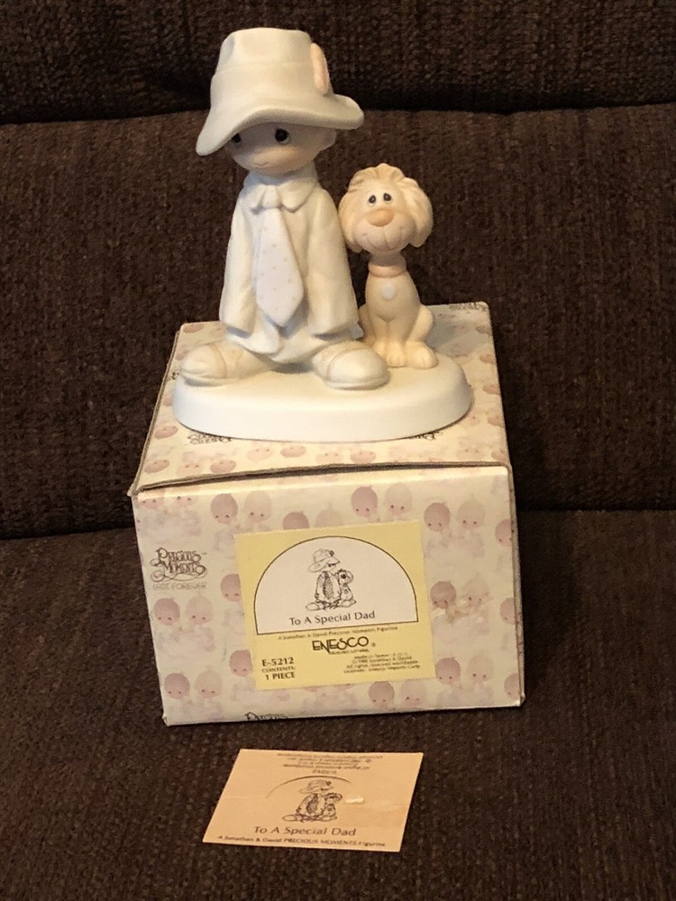 Precious Moments Figurine To A Special Dad / E-5212 / 1980 Jonathon & David Little boy dressed like dad Clean piece with no chips or cracks Original box