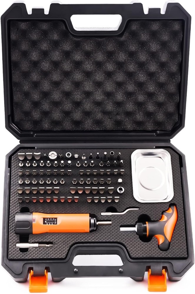 Precision 1/4" Torque Screwdriver Set Adjustable from 10 to 70 In-Lbs Engineering Repair Kit Maintenance Tools with T-BAR Ratchet Screwdriver, Set of 92 pieces ALL-in-ONE: Our 92-piece precision 1/4" torque screwdriver (10 to 70 In-Lbs) toolset has almost everything you need for convenient and effective repair and maintenance. Including torque wrench, T-BAR ratcheting wrench, rubber hammer, magnetic collector, adapters, and screw heads in Flat, Phillips, Hex, & Torx styles. SUPERIOR MATERIAL: This toolset is made of strong and sturdy S2 steel. All tools are protected with anti-rust oil to be corrosion resisted. Anti-rust oil is necessary for maintenance purposes. Toolset Includes: 54 Flat bits, 15 Specialty bits, 8 Hex bits, 4 Phillips bits, 3 Torx bits, 2 square to hex adapter, 1 bit extension, 1 T-BAR wrench, 1 torque wrench,1 magnetic collector, finger cots ,and a toolbox. Human-centered Design: The portable box is designed for well-organizing, storage, and transport. All flat screw heads are hollow-ground to perfectly fit all the screws. And the T-BAR handle is a best fit to your hands which improves the experience during every single turn. SATISFACTION SATISFACTION GUARANTEED: Our strong satisfaction and friendly customer service have your six covered. Extra anti-rust oil is recommended for longer-lasting.