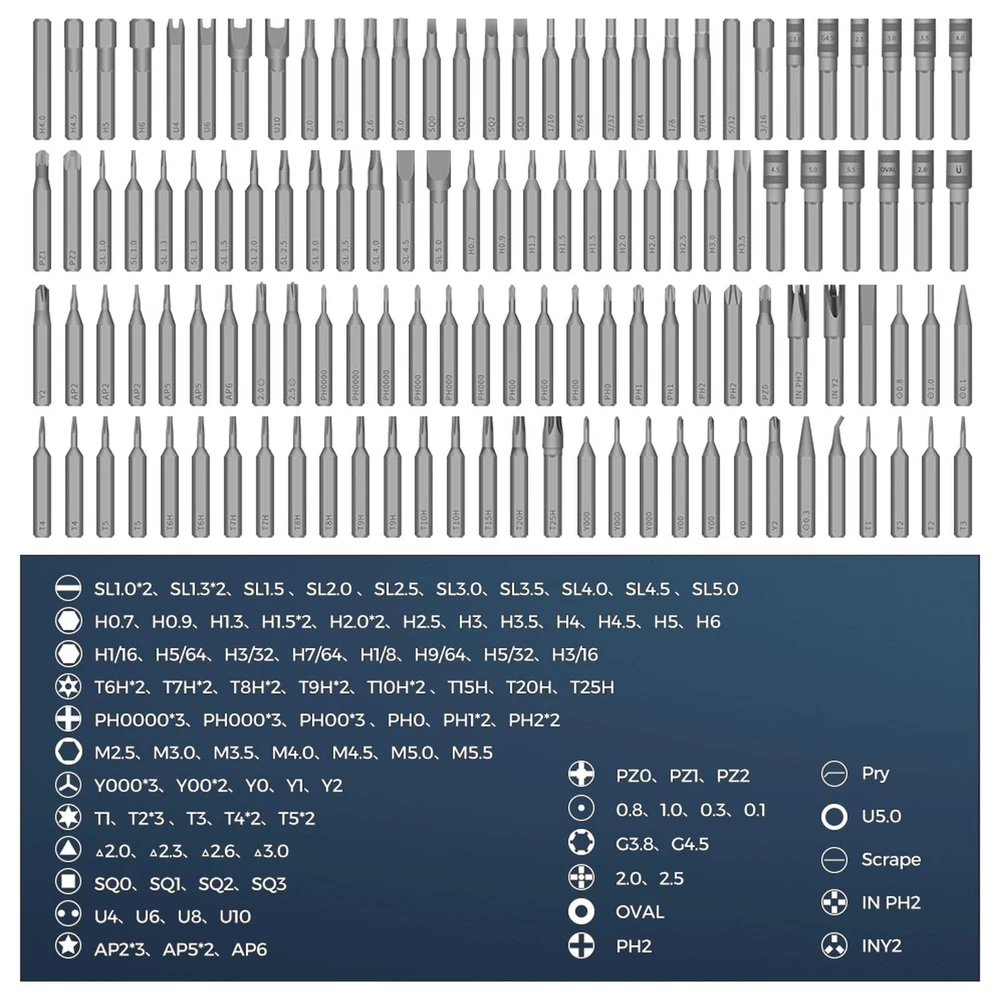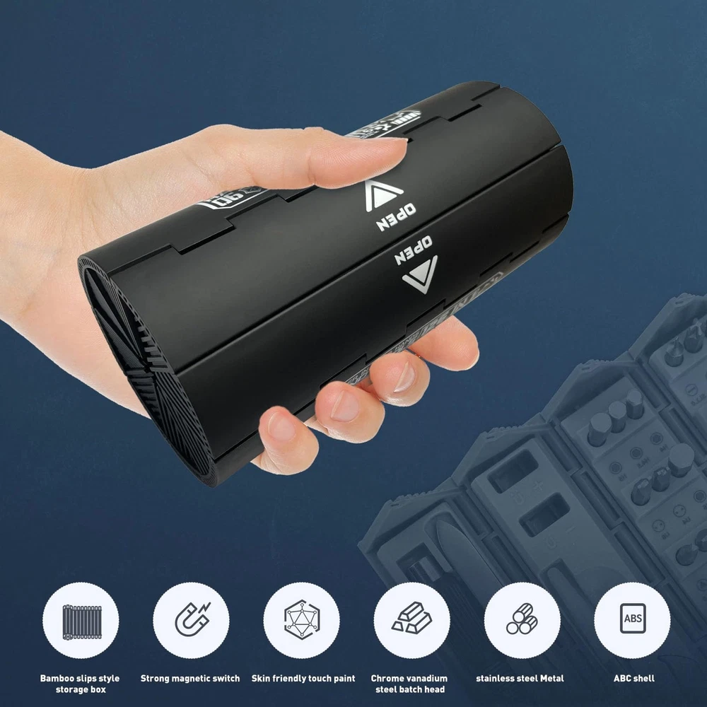 Mini Screwdriver Set: 1. Outer box: ABS, sprayed with rubber paint on the surface of the box 2. Handle: PP+TPR 3. 120 Bits: H4 * 28mm, CRV surface treated with phosphating ash 4. Accessory content: 122mm PP+TPR black grey plastic handle 115mm 304 stainless steel tweezers The 130mm metal soft rod 140mm CRV chrome plated metal pry bar 83mm grey POM pry bar 【120 Magnetic CR-V Batch Heads】The mini screwdriver set contains 126 screwdriver heads - Phillips, Torx Security, Star, Pentalobe, Flat Head, Hex, Triangle, Triwing, Gamebit, Nut Driver, Square, Spanner, ICS, and fine tweezers and metal drills to cover your daily maintenance work for phones, electronics, laptops, watch, camera, consoles, etc. 【Mechanical Reel Deasign】Small screwdriver set adopts the shape of octahedron column. Small size, large capacity, easy to carry, and space saving. In addition, the product casing is made of sturdy materials, and all accessories are securely fixed inside without falling off. The unique casing is easy to open and cleverly concentrates 126 screwdriver heads. 【Multi-Function Anti-Slip Handle】The magnetic drive kit grip of this product conforms to ergonomics, adopts anti slip texture design, and is equipped with a 360° rotatable top cover. The handle is equipped with a built-in magnet. 【Great Gifts】The screw driver kit designed with Mechanical Reel. personalized appearance design,large capacity storage. It is a very special gift for every man, which can be a Christmas, Valentine's Day Gifts to your belove one, whom like DIY and FIX, make your life more romance and convenient, help you work efficiently and intelligently. 【What's in the box】1* Screwdriver+120*Magnetic CR-V Batch Heads +1*Stainless Steel Tweezers+1*Metal Pry Bar+1*Plastic Pry Bar +1*Magnetiize & Demagnetize+1*Stretable Extension Rod+1*User Manual+1* Mechanical Reel Outer Box