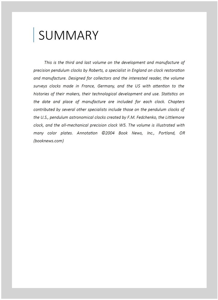 Precision Pendulum Clocks : France, Germany, America, and Recent Advancements, Hardcover by Roberts, Derek, ISBN 0764320211, ISBN-13 9780764320217, Brand New, Free shipping in the US This is the third and last volume on the development and manufacture of precision pendulum clocks by Roberts, a specialist in England on clock restoration and manufacture. Designed for collectors and the interested reader, the volume surveys clocks made in France, Germany, and the US with attention to the histories of their makers, their technological development and use. Statistics on the date and place of manufacture are included for each clock. Chapters contributed by several other specialists include those on the pendulum clocks of the ., pendulum astronomical clocks created by . Fedchenko, the Littlemore clock, and the all-mechanical precision clock W5. The volume is illustrated with many color plates. Annotation ©2004 Book News, Inc., Portland, OR ()