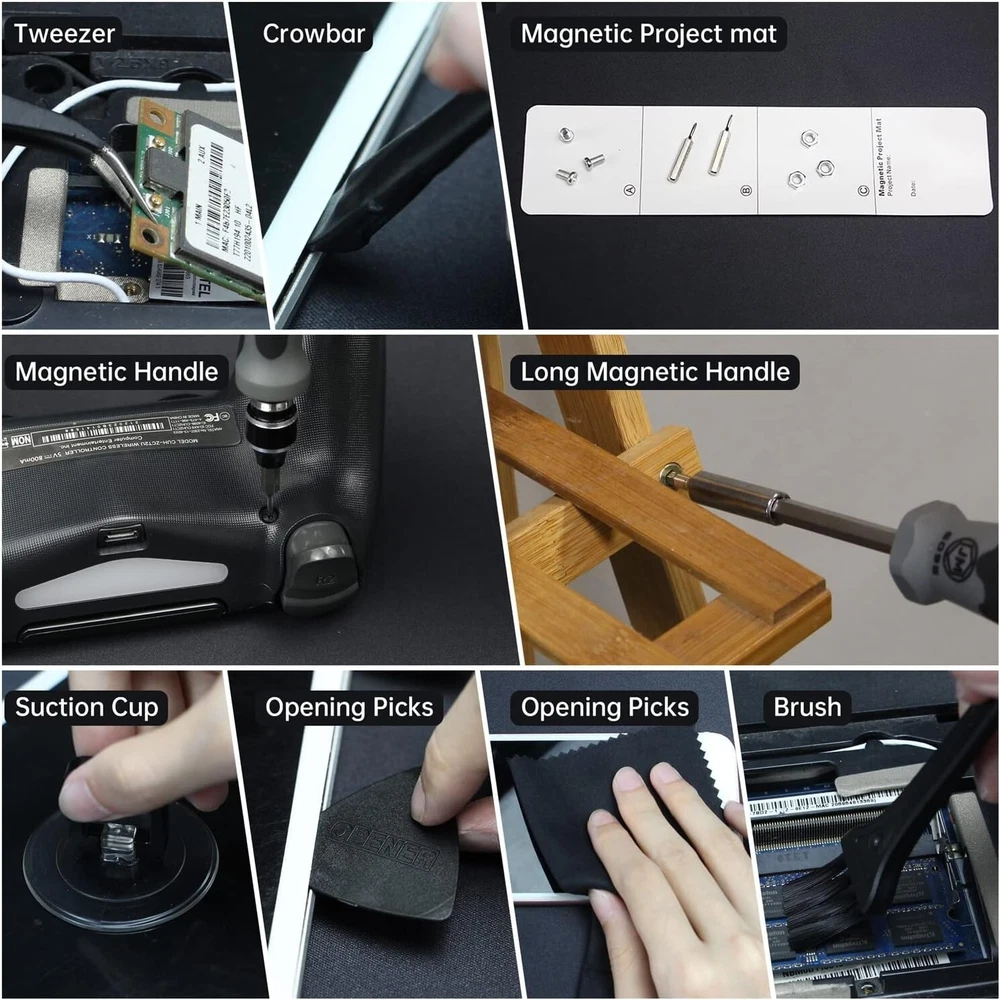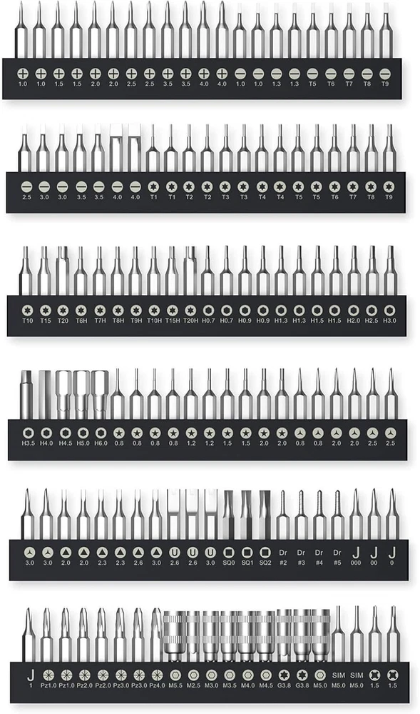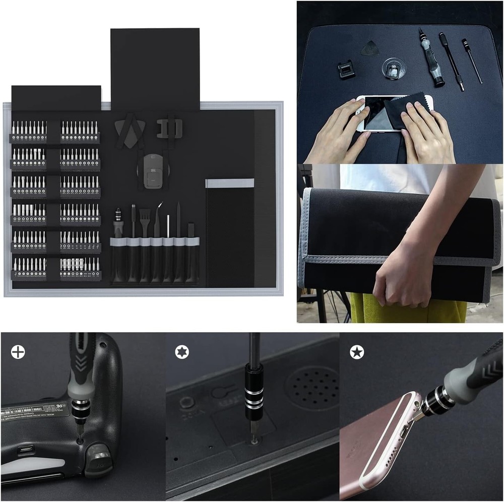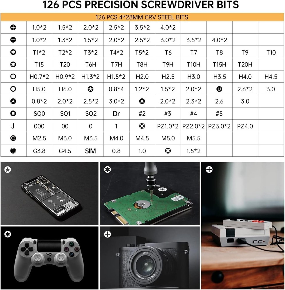 Juego De Destornilladores De Precisión, Kit De Herramientas De Reparación 141PCS Kits de reparación de dispositivos electrónicos: este kit de herramientas PRO Tech incluye 16 tipos de puntas de destornillador magnéticas de 4 x 28 mm (paquete de 126) para portátiles, MacBook, tabletas, ordenadores de escritorio, iPhone, teléfonos, cámaras, PS5, Xbox, Nintendo Switch, consolas de control, relojes, gafas, televisores, drones, coches RC, timbres, juguetes, modificaciones y bricolaje. Kit ... 【Múltiples puntas de destornillador】Este juego de destornilladores de precisión 142 en 1 incluye un juego de puntas Torx (T1 a T10, T15, T20, T6H a T10H, T15H, T20H), Phillips (+1.0 a +2.5, +3.5, +4.0), ranurado (-1.0 a -4.0), pentalobe (☆0.8, ☆1.2, ☆1.5, ☆2.0), hexagonal (H0.7 a H6.0), tri-wing (Y0.8 a Y3.0), triangular (△2.0 a △3.0), pozidriv (Pz1.0 a Pz4.0), zócalo (M2.5 a M5.5, G3.8, G4.5), separador (+1.5), broca (Dr#2 a Dr#5), cuadrado Puntas (SQ0 a SQ2), puntas JIS (J000 a J1), puntas tipo U (U2.6, U3.0), puntas de expulsión SIM (0.8, 1.0). 【El juego incluye componentes】Este kit de destornilladores multipunta incluye un mango pequeño con tapa giratoria, cepillo ESD, pinzas angulares, extensión de soporte, extensión flexible, spudger, abridor, 6 púas de apertura, ventosa pequeña y magnetizador, especialmente diseñado para la reparación de dispositivos electrónicos. 【Material y seguridad】Estas puntas de destornillador magnéticas reemplazables están hechas de acero al cromo-vanadio (HRC 52-58), de gran dureza, durabilidad y precisión, y no dañan los dispositivos. Mango moderno, antideslizante y aerodinámico, cómodo, ideal para ingeniería mecánica. La bolsa de herramientas portátil está hecha de tela Oxford 600D. PELIGRO DE ASFIXIA: el juego de puntas de destornillador contiene piezas pequeñas.