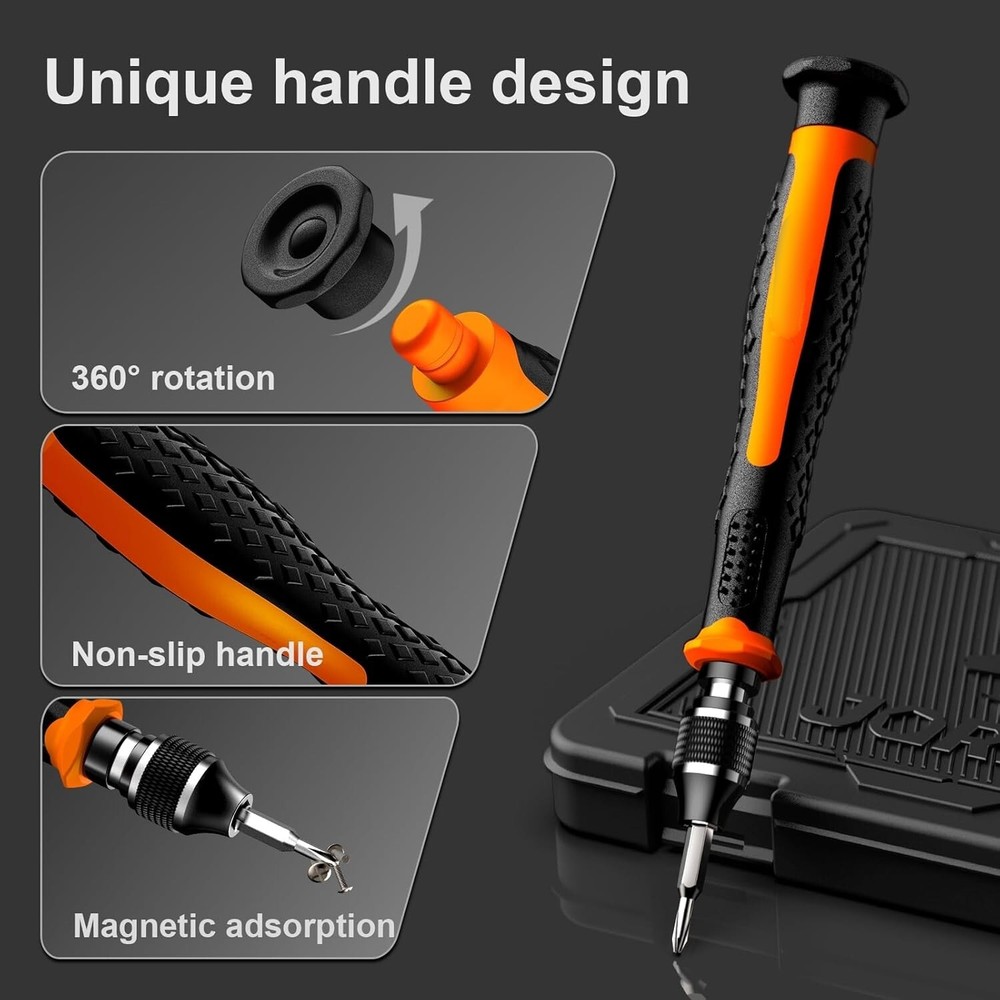 Juego De Destornilladores De Precisión 38, Regalo Para Hombres, Kit De Her NUEVO 【Juego de destornilladores de precisión】-- El juego de destornilladores de 38 piezas tiene 30 puntas de destornillador CRV que son phillips PH000(+1.2) PH000(+1.5) PH00(+2.0) PH0(+3.0) PH1(+4.0), cabeza plana -0.8 -1.2 -1.5 -2.5 -3.0, torx T1 T2 T3 T4 T5, torx security TR6 TR7 TR8 TR9 TR10 TR15 TR20, triwing Y000(Y0.6) Y00(Y1.5) Y0(Y2.5) Y1(Y3.0), pentalobe P2(0.8) P5(1.2) P6(1.5), MID 2.5, con un mango de destornillador, un spudger de doble punta, un spudger largo, un spudger triangular, pinzas, un cepillo de limpieza y una ventosa Con dedal para tarjeta SIM. 【Mango giratorio antideslizante】-- Todas nuestras puntas de destornillador están fabricadas en acero al cromo vanadio CR-V de alta calidad. Las puntas CR-V no se oxidan fácilmente ni se rompen. El mango del destornillador está fabricado con materiales TPR y PP, con un diseño antideslizante especial que ofrece una gran comodidad. La parte superior del mango tiene un diseño giratorio que facilita la extracción de los tornillos; la cabeza del mango y la del tornillo cuentan con adsorción magnética que permite reemplazar los tornillos rápidamente. 【Dispositivos portátiles】-- El spudger triangular es ideal para abrir la pantalla del teléfono móvil. El spudger de doble punta es ideal para abrir la tapa trasera de consolas. El spudger largo permite hacer palanca en las partes internas del dispositivo. La ventosa permite abrir la pantalla, lo que facilita la reparación del teléfono móvil. El dedal para tarjeta SIM se puede utilizar para reemplazar la tarjeta SIM del teléfono móvil. El cepillo de limpieza limpia el polvo del dispositivo. Las pinzas sujetan piezas pequeñas. 【Amplia gama de aplicaciones】-- +1.5/2.0 P2 Y0.6 MID2.5 se utilizan para iPhone 7/8/X/XR/11/12/13. +1.2/1.5/2.0/3.0 T2/3/4/5 P2 se utilizan para Samsung/Huawei/Xiaomi y otros teléfonos. +1.5/2.0/3.0 T3/4/5/6/9 se utilizan para iPad/Mini/Air/Pro. +1.2/1.5/2.0/3.0/4.0 T2/3/4/5 -2.5 se utilizan para Huawei/Honor y otras tabletas. P2/5/6 +1.5/2.0/3.0/4.0 T3/4/5/6/7/8/9 Y2.5/3.0 se utilizan para Macbook/Air/Pro. +1.5/2.0/3.0 T5 se utilizan para Kindle/Kindle Fire. T6/15 se utilizan para Ring Video Doorbell/Video Doorbell 2/Pro/Elite. 【Amplia gama de aplicaciones】-- T8 +1.5/2.0/3.0 se utilizan para mandos y consolas PS3/PS4/PS5. T6/8/10 se utilizan para mandos y consolas Xbox 360/Xbox One/Xbox Series. Y1.5/2.5/3.0 +1.5/2.0 se utilizan para Switch/NS-Lite/Joy-Con/Wii/Game Boy Advance. T3/8 se utilizan para pulseras/cuchillos plegables Fitbit. +1.2/1.5/2.0/3.0/4.0 T3/4/5/6/7/8/9 Y2.5/3.0 -2.5 se utilizan para Microsoft/Acer/Dell y otras computadoras portátiles. +1.2/1.5/2.0/3.0/4.0 -0.8/1.2/1.5/2.5/3.0 se utilizan para computadoras de escritorio/relojes/gafas/juguetes.