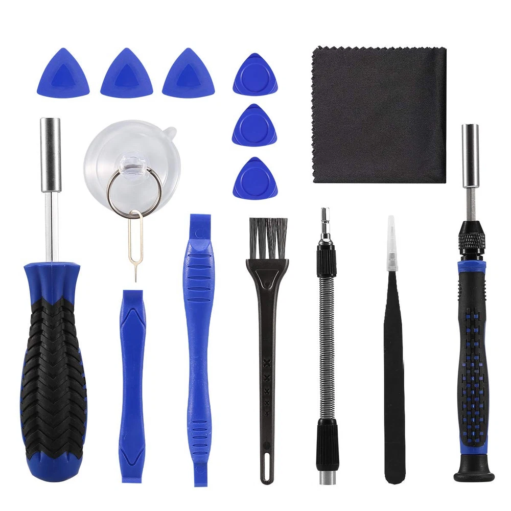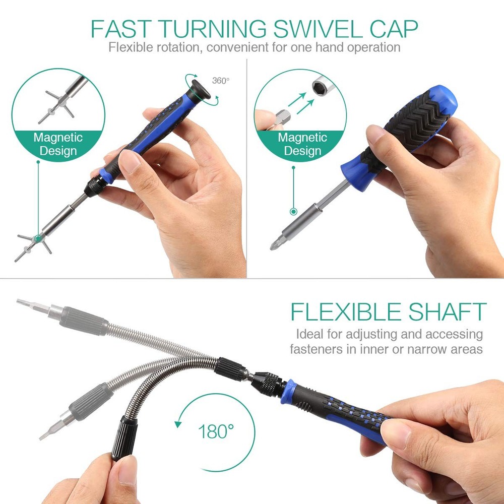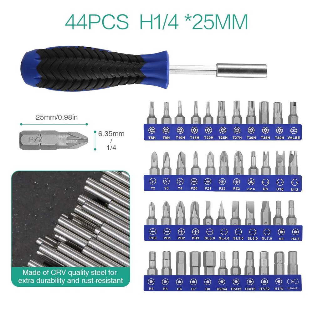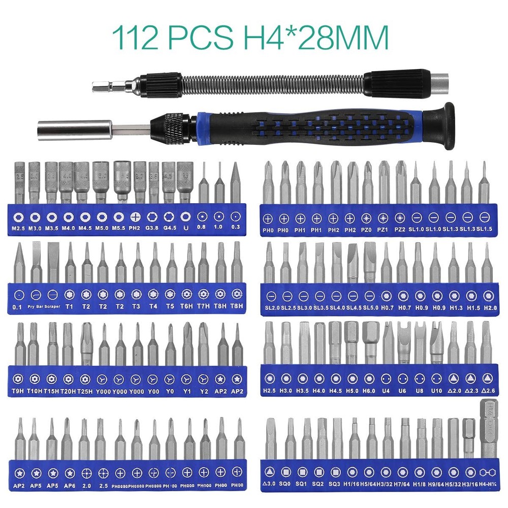 Package Contents: 156 x Precision screwdriver bits 1 x 4mm bit handle body 1 x Electric handle 1 x Transparent suction cups 1 x Black plastic soft rod 1 x Short crowbars(80mm) 1 x Long crowbars(120mm) 1 x Card removal pin 1 x Brush with black plastic handle 1 x Tweezers 6 x Blue triangles 1 x Cleaning cloth 156 PCS Screwdriver Bits: 172-in-1 screwdriver set with 112 PCS 4mm bits, 44 PCS 6.35mm electric bits, covering all commonly used bits. With Phillips, pentalobe, torx, hex, slotted, triangle, square and other sizes, which can meet the needs of most maintenance tools in daily life. Potable Storage Bag: The screwdriver tool is packed in a well-organized storage bag that can be carried easily. More Flexible Extension Rod: There is an adjustable extension rod and a flexible shaft for some electronics where the screws are not on the surface. Wide Applications: This screwdriver set is equipped with 156 precision screwdriver bits and 16 repair parts for repairing most smartphones, laptops, toys, glasses, computers, watches, electronic digital products, etc. Package Contents: 156 x Precision screwdriver bits 2x handle 1 x Transparent suction cups 1 x Black plastic soft rod 1 x Short crowbars(80mm) 1 x Long crowbars(120mm) 1 x Card removal pin 1 x Brush with black plastic handle 1 x Tweezers 6 x Blue triangles 1 x Cleaning cloth.