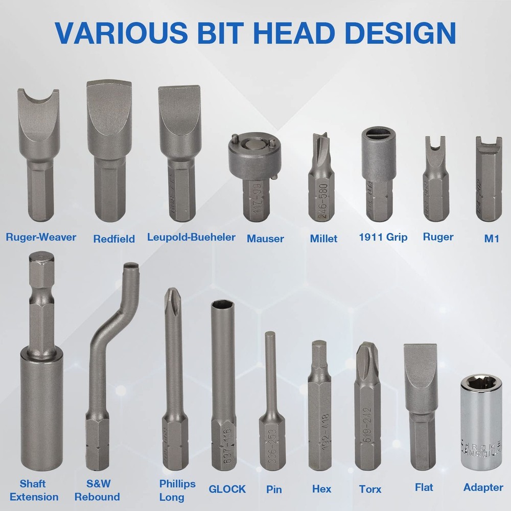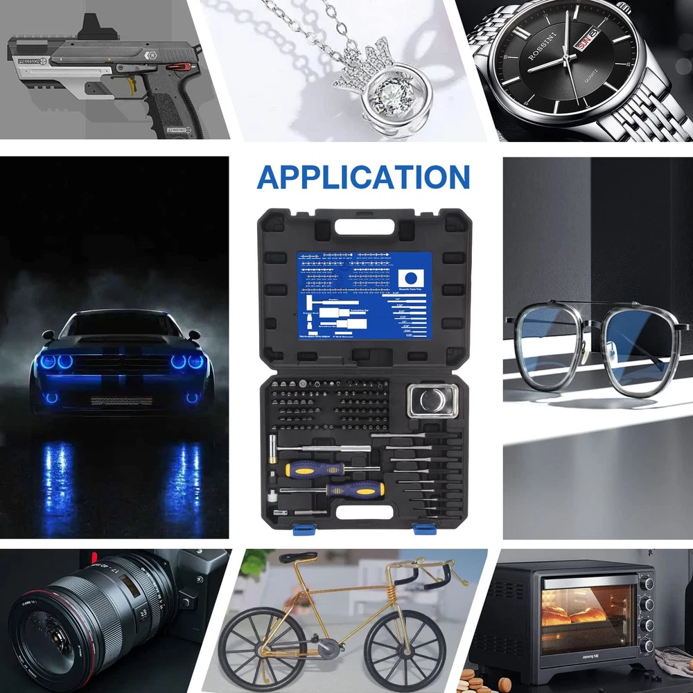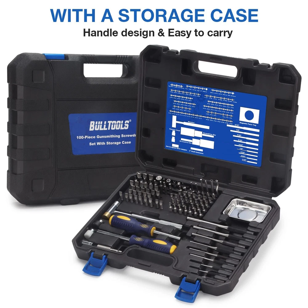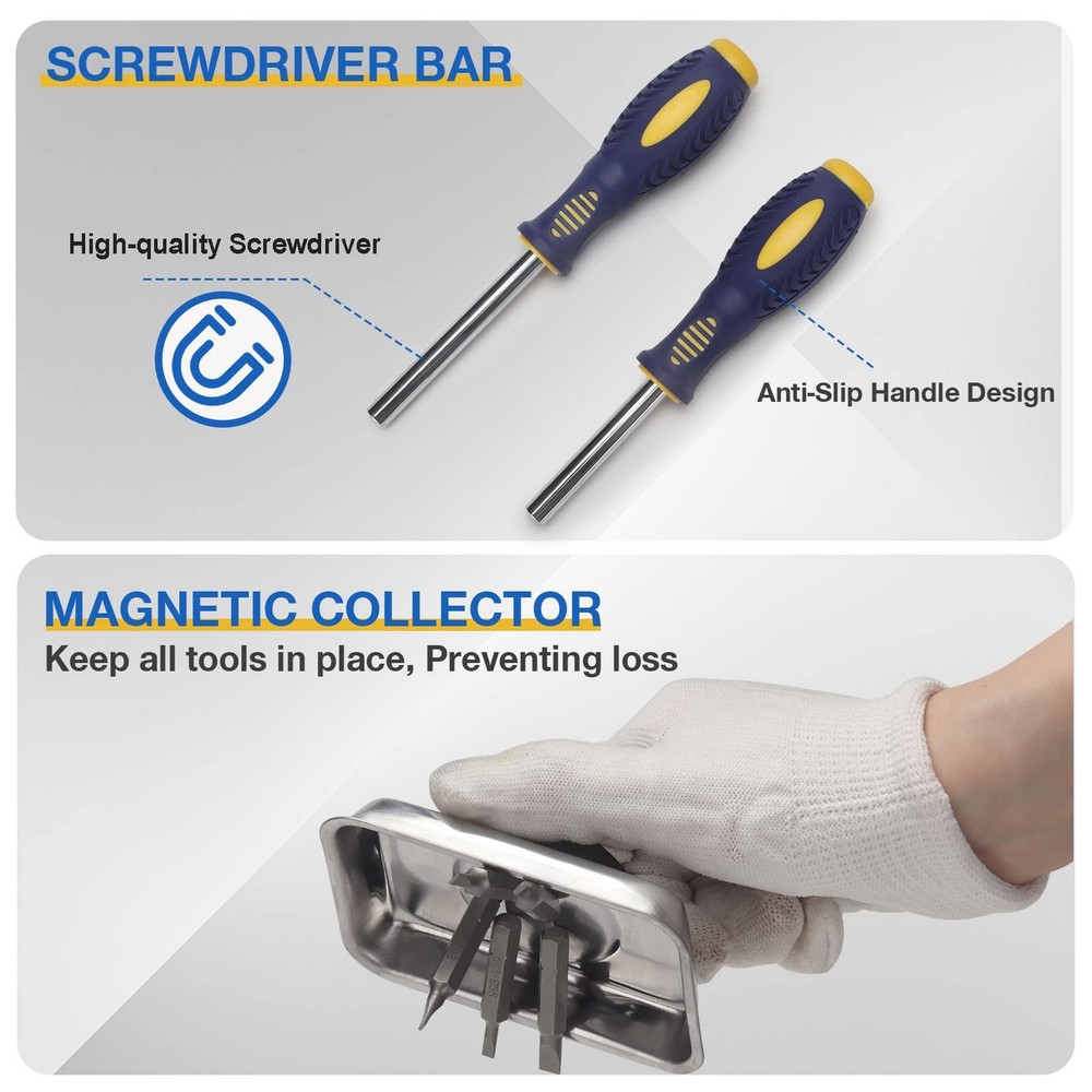 【PROFESSIONAL SCREWDRIVER SET】: Including 84×Screwdriver Bits; 9×Roll Pin Punch; 2×Screwdriver Bar; 2×Hammer Head; 1×Hammer; 1×Hex-to-square Drive Adapter; 1×3” Shaft Extension; 1×magnetic parts tray. Meets all your work needs. 【SUPERIOR QUALITY】: This toolset is made of strong and sturdy S2 steel. All tools are protected with anti-rust oil to be corrosion resisted. Anti-rust oil is necessary for maintenance purposes. 【BIT HEAD DESIGN】: Precision screwdriver bits includes 54 Flat bits, 15 Specialty bits, 8 Hex bits, 4 Phillips bits, 3 Torx bits. Screw heads in Flat, Phillips, Hex, & Torx styles has almost everything you need for convenient and effective repair and maintenance. 【MULTI APPLICATION】: It can be widely used in most projects such as home appliance maintenance, furniture assembly, automobile repair and so on. Extra anti-rust oil is recommended for longer-lasting. 【PORTABLE CASE】: This Torque Screwdriver Engineering Repair Kit comes with a plastic carrying case, which makes the tool easy to organize, store and transport. Effectively save your time.
