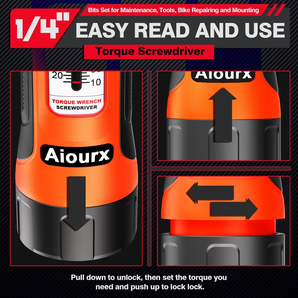 MATERIAL: The torque screwdriver is constructed from premium alloy steel and ABS resin. The head is made of hardened alloy steel. The resin handle is comfortable to grip, anti-skid, and corrosion-proof. The color-coded bits: Hex, Slotted, and Torx bits constructed with S2 steel for extremely durability HIGH ACCURACY: Calibrated according to DIN 6789, 10 to 55 inch-pounds is pre-calibrated accuracy of +/- 3, 55 to 70 inch-pounds is +/- 4%. When the pre-set torque value is reached, you will hear audible "click" sound EASY READ AND USE: Pull down to unlock, then set the torque you need and push up to lock lock. Clear range scale, easier to read and reduce errors VERSATILE: It be used to apply torque to scope mounting, bicycle and precision instrument. It is perfect for hunters, road cyclists and road motorcycle enthusiasts PACKAGE: 1 x Torque screwdriver, 30 x Bits: PH0, PH1, PH2, PH3; SL3mm, 4mm, 5mm, 6mm, 8mm, 11mm; T6, T8, T10, T15, T20, T25, T30, T40; H3/32", 7/64", 5/32", 3/16", H2mm, 2.5mm, 3mm, 4mm, 5mm, 6mm, 8mm. 1 x 1/4" hex to 1/4" driver socket adapter, and protective hard case