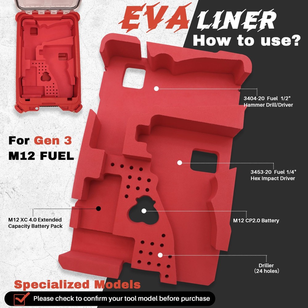Maximize Your Packout Tool Box with ’s Custom Foam Insert! Upgrade your 48-22-8435 Packout Tool Box with ’s premium EVA foam organizer, engineered for craftsmen who demand precision and durability. Designed to seamlessly integrate into your Packout ecosystem, this insert transforms your toolbox into a fortress of organization, safeguarding your M12 FUEL tools (3404-20, 3453-20, 3497-22) and accessories with good protection. Perfect Fit for 48-22-8435: Designed exclusively for Milwaukee Packout 48-22-8435 Tool Box, this EVA foam insert ensures a snug, secure fit to maximize storage efficiency and protect your tools from bumps and scratches Precision-Cut EVA Foam: Crafted with advanced laser-cutting technology, our foam insert features contoured slots tailored for M12 FUEL tools (3404-20, 3453-20, 3497-22) and accessories, keeping everything organized and instantly accessible Durable & Lightweight: Made from high-density EVA material, this Packout organizer resists wear, moisture, and oxidation while remaining lightweight. Built to endure job site rigors, it’s the ultimate upgrade for 48-22-8435 tool box accessories Quick Setup, No Hassle: Simply drop the foam insert into your 48-22-8435 toolbox and arrange tools into pre-cut slots. Includes a step-by-step guide for effortless organization—no trimming or adjustments needed Satisfactory service: Our EVA liner is designed to meet your needs. If you have any questions about our products, please feel free to contact our customer service support for a satisfactory solution