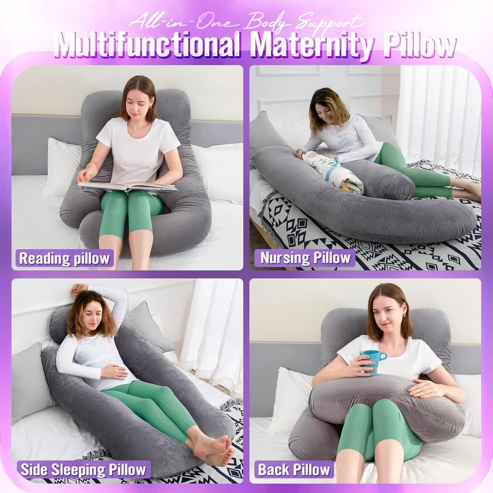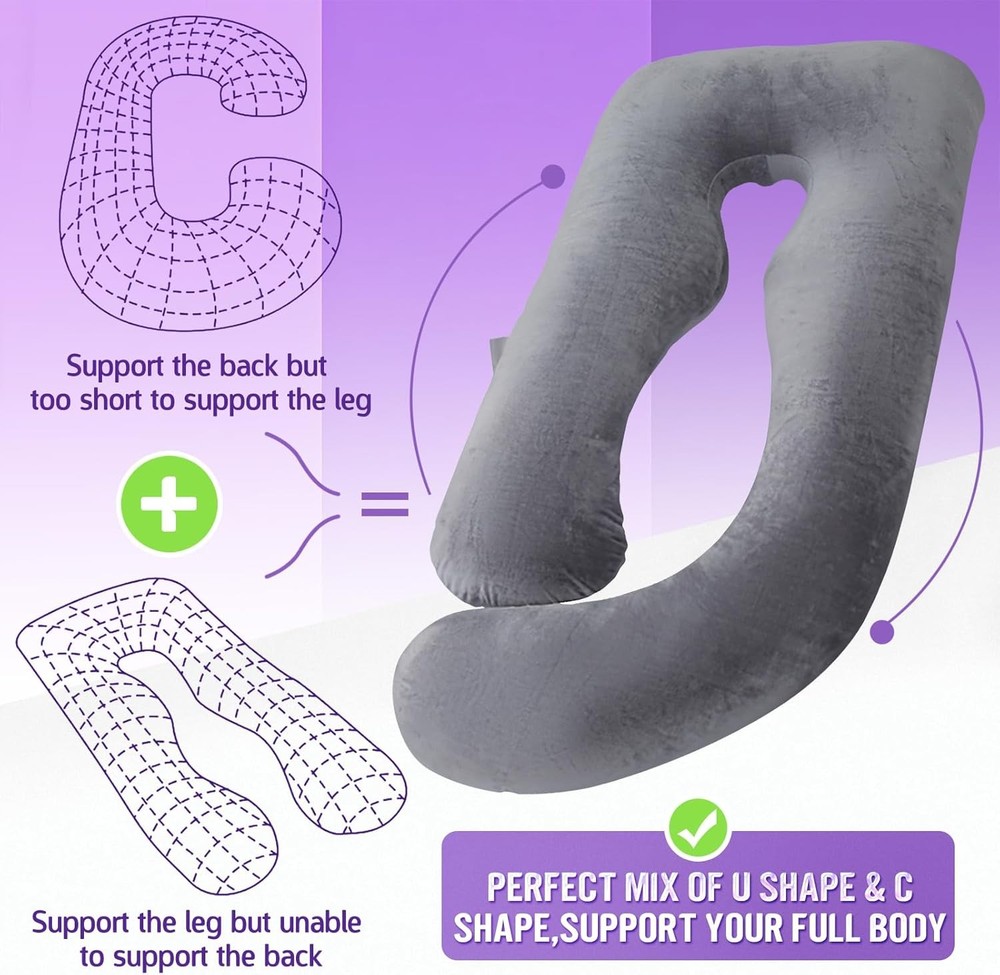 About this item New and Upgraded U-Shaped Pregnancy Pillow: The special feature of the upgraded maternity pillow is that, different from the ordinary U-shaped pillow, we have increased the length of one side to better cover the pregnancy mom. Maternity Pillows are designed to relieve pressure on the head, neck, spine, hips, knees and back. It promotes proper spinal alignment and helps find a comfortable position for a good night's sleep Multipurpose Maternity Pillow: Maternity pillow that can accompany you throughout your pregnancy. After the baby is born, this maternity pillow can also be used as a nursing pillow, freeing mother's hands. This is a great gift for mom-to-be Get Enough Sleep: Our versatile pillows give you multiple sleeping positions! It helps reduce tossing and turning, effectively relieves low back pain. You can also use it as a post-operative pillow, providing padding where you need it. Whether you have had knee or hip replacement, spine or shoulder surgery, this pillow will help Equally Comfortable For Men: Adults of all ages and sizes will benefit from our comfortable pillow designed to hug your entire body when lying on your side, back or belly Safe Packaging: The vacuum-sealed packaging prevents any damage and includes a new u-shaped pillow. To make it fluffy, just press, pinch, fold it for a while after receiving it, and it will return to its original shape