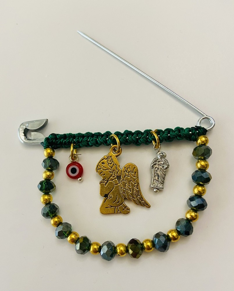 Protection Pregnancy Pin Baby Brooch Evil Eye San Judas Angel Amulet This Pregnancy Pin/Safety Pin/Baby Brooch, makes a perfect accessory for pregnant women or babies, besides the beautiful way this pin looks, it serves as an amulet for protection against any evil or negativity. Add it to your baby collection today!