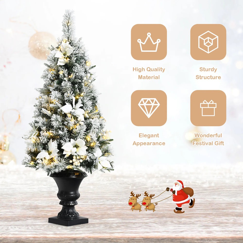 Our gorgeous entrance tree can not only refresh your room decor, but also leave a good impression for your guests. Made of premium materials, this tree is odorless, non-toxic and nonflammable in daily use. Thanks for 100 LED lights which will create warm and romantic party atmosphere. Come and buy it and using it to make a warm welcoming place or increase festive atmosphere!Features: Premium new material for safe and long-term use Stable base allows the tree can stand firmly anywhere Equipped with 100 LED lights and you can enjoy a brilliant lighting show Trimmed with classic Xmas elements such as holy white flowers and berries 3 different types of branch tips make the tree ultra-realistic Totally a gorgeous entrance tree that can refresh your room decorSpecification Color: Green Free Shipping Over $49.99* Details Prelit Flocked Christmas Entrance Tree Pack Artificial Christmas Tree Product Description: Our gorgeous entrance tree can not only refresh your room decor, but also leave a good impression for your guests. Made of premium materials, this tree is odorless, non-toxic and nonflammable in daily use. Thanks for 100 LED lights which will create warm and romantic party atmosphere. Come and buy it and using it to make a warm welcoming place or increase festive atmosphere! Features: Premium new material for safe and long-term use Stable base allows the tree can stand firmly anywhere Equipped with 100 LED lights and you can enjoy a brilliant lighting show Trimmed with classic Xmas elements such as holy white flowers and berries 3 different types of branch tips make the tree ultra-realistic Totally a gorgeous entrance tree that can refresh your room decor Specification ColorGreen MaterialNew PVC, New PE, Plastic Overall Dimensions4' x 1.8'(H x D) Net Weight10 lbs Number of Tips223(156 PVC Tips, 33 Pine Needles, 34 PE Tips) Number of Lights100 Package includes: 1 x Pre-lit Snow Flocked Entrance Tree