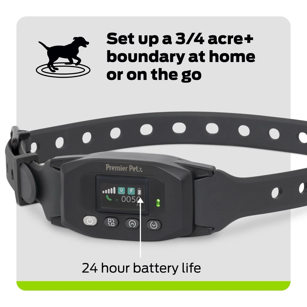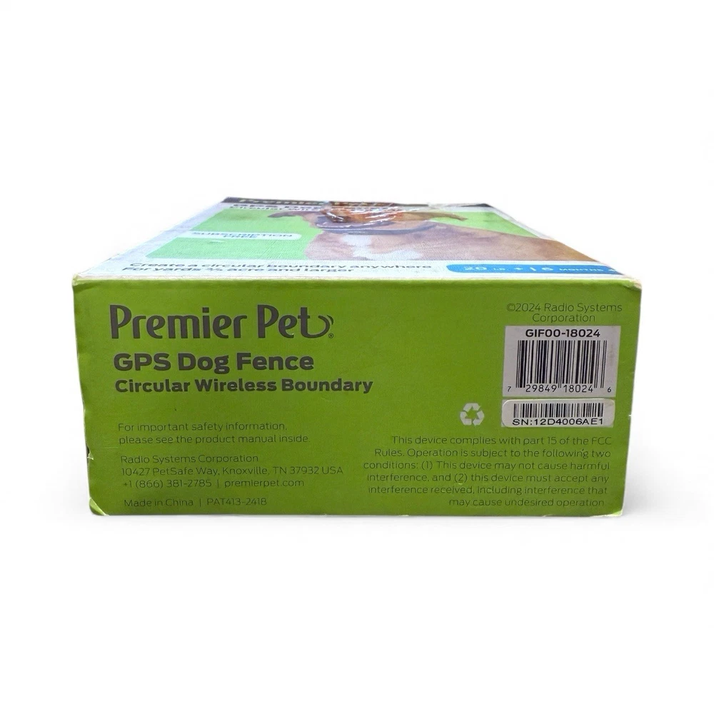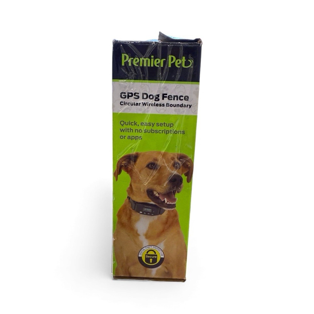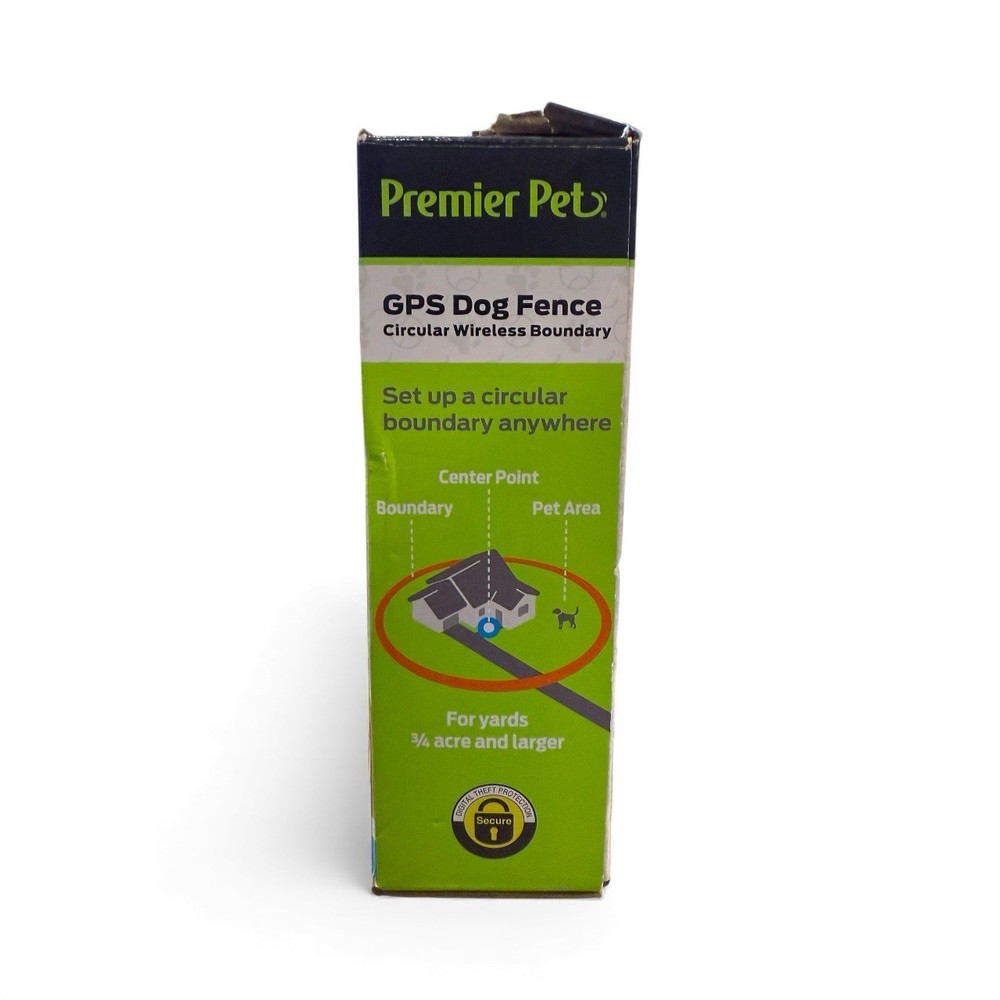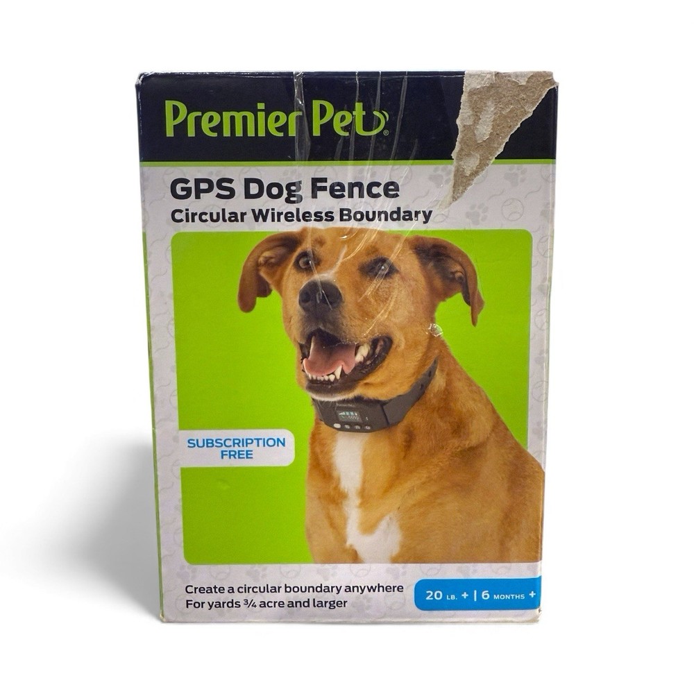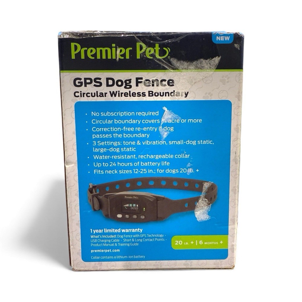 Keep your dog safe and secure with the Premier Pet GPS Dog Fence, a circular wireless boundary system with no subscription fees. Perfect for yards ¾ acre and larger, this system uses GPS technology to create a safe play area for your pet without the need for buried wires or digging. Key Features: • No Subscription Required – One-time purchase. • Covers ¾ acre+ – Expandable circular boundary. • Correction-Free Re-Entry – Dog can return home without correction. • 3 Correction Modes – Tone & vibration, small-dog static, large-dog static. • Rechargeable, Water-Resistant Collar – Up to 24 hours of battery life. • For Dogs 20 lbs+ – Adjustable collar fits neck sizes 12–25 inches. • Quick Setup – Easy to use, no app or digging required. Package Includes: • GPS Dog Fence Collar with built-in lithium-ion battery • USB charging cable • Short & long contact points • Original box (worn condition) Note: MISSING MANUAL & TRAINING GUIDE