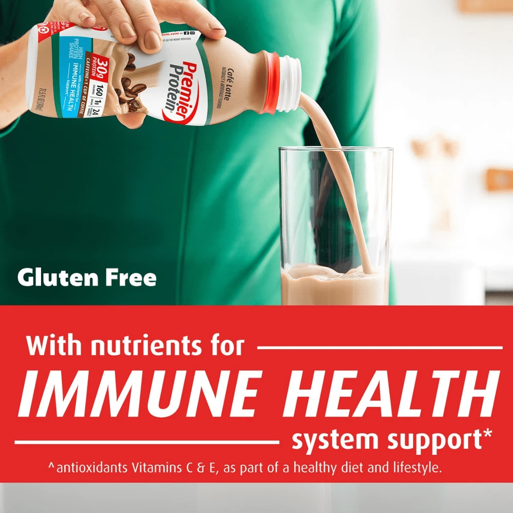 Product details Café Latte 30g Protein Shake has caffeine = 1 cup of coffee to start your day. Packaged in a recyclable 11.5 fl oz bottle, each Premier Protein Shake contains 30 grams of protein, complete with all of the essential amino acids, 1g of sugar, 3-5g carbs (depending on flavor), 160 calories, 24 vitamins & minerals, and is also low in fat. We use a proprietary blend of milk protein and casein in our shakes to help fuel muscles quickly and for several hours to help support your goals. Enjoy a shake as a healthy snack, a breakfast on-the-go, an afternoon snack, or as pre- or post-workout fuel. They are delicious as is but are also highly customizable. Try blending with your favorite fruits and vegetables for a delicious smoothie or adding to cereal or oatmeal. Available in 12 delicious flavors: Chocolate, Vanilla, Cafe Latte, Caramel, Cookies & Cream, Strawberries & Cream, Bananas & Cream, Peaches & Cream, Cinnamon Roll, Chocolate Peanut Butter, Cake Batter Delight and Cookie Dough. Rise and shine with the luscious creamy coffee flavor and energy from caffeine equal to 1 cup of coffee; Winner of American Masters of Taste Gold Medal for SUPERIOR TASTING ready-to-drink protein beverages. 30g of protein to help curb your hunger, as a mid-day snack or for post workout recovery; includes all essential amino acids. 24 Vitamins and Minerals: Support a healthy immune system as part of a healthy diet and lifestyle (Antioxidants Vitamins C and E plus Zinc), 50 percent daily value of calcium and 30 percent daily value of Vitamin D to help maintain healthy bones. Guilt free indulgence: 1g Sugar, 3-5g Carbs (depending on flavor), 160 Calories and Low Fat; Gluten Free, Keto and Bariatric Friendly, Kosher. We're all in it together when it comes to helping out the environment! That's why we've designed a more sustainable shake bottle. We've lowered our carbon footprint and created a bottle that's easier to recycle by using less material, eliminating the foil seal on the bottle, and switching to PET plastic. Oh, and don't worry- your shakes will still taste just as amazing as always! Skip the hassle of protein powder with the convenience of this ready to drink protein shake; great on the go nourishment that also pairs well with coffee, cereal, a pancake recipe, or in your favorite smoothie. NOTICE: Use this product as a food supplement only. Do not use for weight reduction. Contains: Milk & Soy Try all twelve (12) flavors: Chocolate, Vanilla, Caramel, Cookies & Cream, Cafe Latte, Chocolate Peanut Butter, Strawberries & Cream, Peaches & Cream, Bananas & Cream, Cinnamon Roll, Cake Batter Delight, and Cookie Dough.