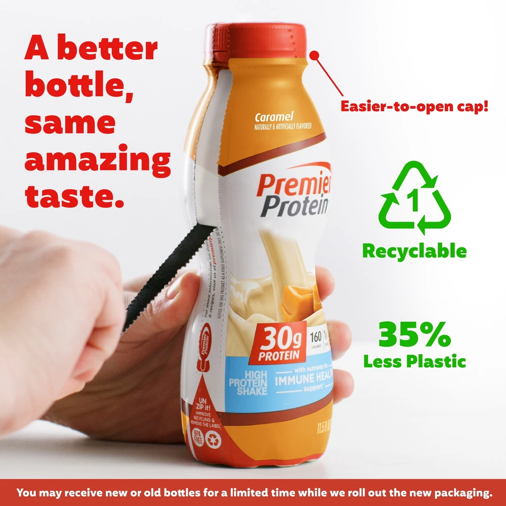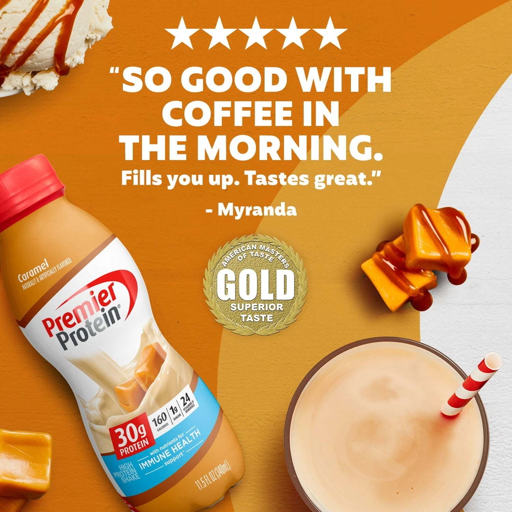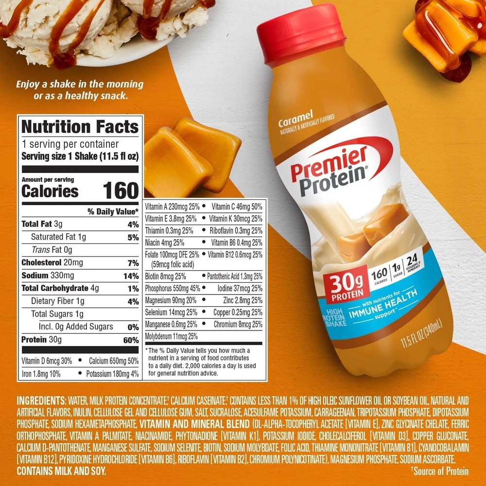 Product details Packaged in a recyclable 11.5 fl oz bottle, each Premier Protein Shake contains 30 grams of protein, complete with all of the essential amino acids, 1g of sugar, 3-5g carbs (depending on flavor), 160 calories, 24 vitamins & minerals, and is also low in fat. We use a proprietary blend of milk protein and casein in our shakes to help fuel muscles quickly and for several hours to help support your goals. Enjoy a shake as a healthy snack, a breakfast on-the-go, an afternoon snack, or as pre- or post-workout fuel. They are delicious as is but are also highly customizable. Try blending with your favorite fruits and vegetables for a delicious smoothie or adding to cereal or oatmeal. Available in 12 delicious flavors: Chocolate, Vanilla, Cafe Latte, Caramel, Cookies & Cream, Strawberries & Cream, Bananas & Cream, Peaches & Cream, Cinnamon Roll, Chocolate Peanut Butter, Cake Batter Delight and Cookie Dough. Like the taste of a sundae with dripping caramel over ice cream, indulge in this caramel flavored protein shake; Winner of American Masters of Taste Gold Medal for SUPERIOR TASTING ready-to-drink protein beverages. 30g of protein to help curb your hunger, as a mid-day snack or for post workout recovery; includes all essential amino acids. 24 Vitamins and Minerals: Support a healthy immune system as part of a healthy diet and lifestyle (Antioxidants Vitamins C and E plus Zinc), 50 percent daily value of calcium and 30 percent daily value of Vitamin D to help maintain healthy bones. Guilt free indulgence: 1g Sugar, 3-5g Carbs (depending on flavor), 160 Calories and Low Fat; Gluten Free, Keto and Bariatric Friendly, Kosher. We're all in it together when it comes to helping out the environment! That's why we've designed a more sustainable shake bottle. We've lowered our carbon footprint and created a bottle that's easier to recycle by using less material, eliminating the foil seal on the bottle, and switching to PET plastic. Oh, and don't worry- your shakes will still taste just as amazing as always! Skip the hassle of protein powder with the convenience of this ready to drink protein shake; great on the go nourishment that also pairs well with coffee, cereal, a pancake recipe, or in your favorite smoothie. NOTICE: Use this product as a food supplement only. Do not use for weight reduction. Contains: Milk & Soy Try all twelve (12) flavors: Chocolate, Vanilla, Caramel, Cookies & Cream, Cafe Latte, Chocolate Peanut Butter, Strawberries & Cream, Peaches & Cream, Bananas & Cream, Cinnamon Roll, Cake Batter Delight, and Cookie Dough.