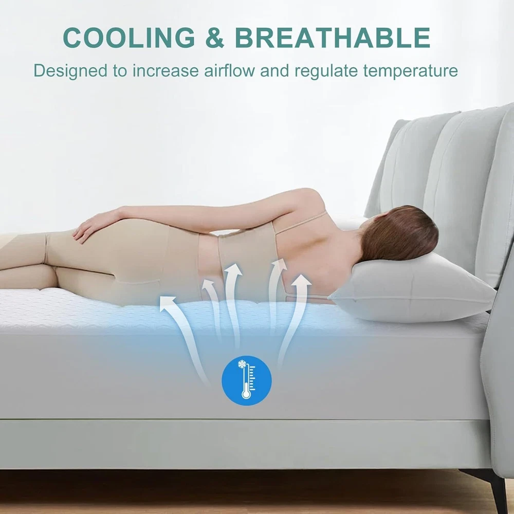 100% WATERPROOF GREATER PROTECTION: Standard 100 by OEKO-TEX certified, there is no need of concern for harmful chemicals or horrible odor. Back of Queen mattress protector cover is made of top TPU, an invisible waterproof barrier to protect your expensive mattress. Queen mattress cover effectively repels dirt and all liquids, including accidental spills, bodily fluids like sweat or urine, thus makes a clean, safe and healthy sleeping environment. 4D AIR COOLING & BREATHABLE: Our mattress topper cover tried to be the most breathable and softest fabric with moisture-wicking function. Cooling Mattress Protector is relatively more breathable, softer than cotton terry/ pure polyester/common rayon mattress cover. SLEEP IN SILENCE: The filling of Cooling Waterproof Mattress Protector is 3D Air Fabric with ultra-fine ventilation holes, which only allows air flow, but quickly locks in invasive moisture and accelerates the moisture evaporation. There won’t be any crinkling or plastic sound when you move. You and your family will enjoy a fresh and silent sleeping environment! 18 INCH POCKET FITS PERFECTLY: Adopting Fitted-sheet Style, all our mattress pad protectors fit 8"-21" thick mattresses and all types of mattress including memory foam, latex or spring mattresses. The highly elastic skirt is made of mesh fabric and has excellent ductility to 100% fit the mattress, without any moving. You will feel the mattress as quiet and comfy as before the cover is applied. If you are not satisfied FOR ANY REASON, Pls contact our Customer Support and we will do everything to make you satisfied. We suggest you buy 2 pieces or more, so you can change one while washing the other. WASHING TIPS: Machine wash cold separately on GENTLE/DELICATE cycle.Tumble dry on low. Do not bleach. Do not dry clean.