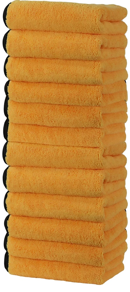 Professional Grade Microfiber Towels for Car, 16" x 16", 12 Pack, 440 GSM Material: Microfiber 30%, Polyester 70%. 12 pack 440 GSM thick non-abrasive microfiber cloths, scratch-free. Dual Sided: Long side (plush side) for soak up water and absorb dust; Short side (soft side) for polishing and buffing. Prevent scratching surfaces, paints, coats or other surface, especially for sensitive paintwork and automotive surfaces Used for a variety of cleaning jobs: cleaning cars, trucks, boats, RV's , TV's, counter tops, and more Size: 16" x 16"