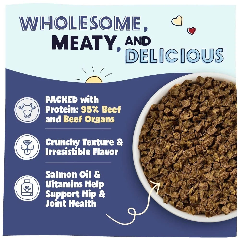 Premium Air Dried Dog Food with 96% Meat, Beef Flavor, 2 lb. Bag Slow cooked in the USA to help retain more of its nutrition with a crunchy texture bursting with flavor Made with 96% beef This recipe is balanced with meat and other wholesome ingredients for a well-rounded option Packed with salmon oil, vitamins, and minerals to support hip and joint health A great alternative to dog food or freeze-dried dog foods