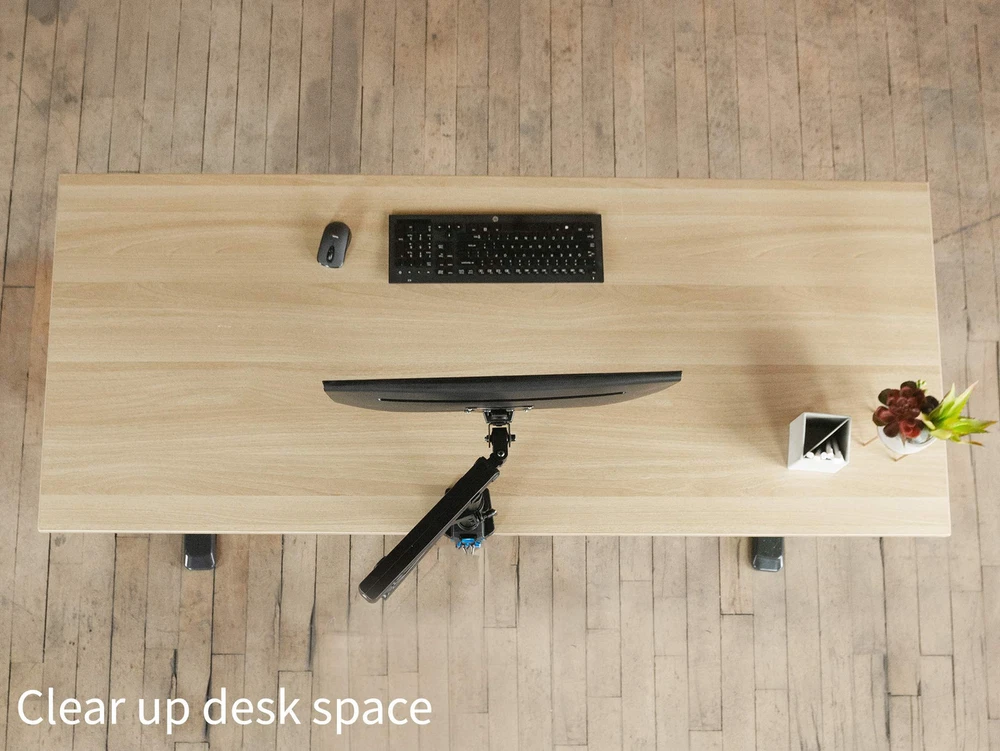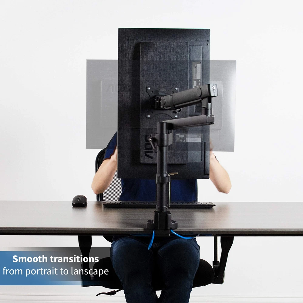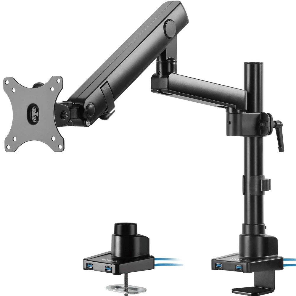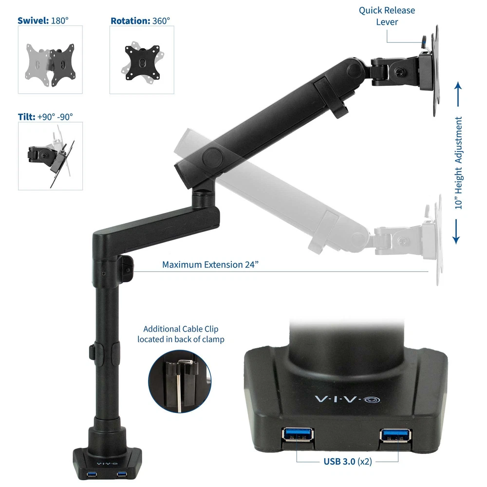 Premium Aluminum Construction - Provides excellent support for one monitor screen weighing up to 17.6 lbs, and the built-in elbow spring gauge allows perfect weight adjustment at any level. Fully Adjustable - Mechanical spring arm offers an exceptional range of flexible motion featuring -90° to +90° tilt, 180° swivel, and 180° rotation. Maximum screen height to the center of the screen is 24.4". Mounting Options - The sturdy desk clamp installs from the top side of your desk for easy setup, and an equally secure grommet mount is provided to accommodate a variety of desk layouts. Recommended desktop thickness ranges from 0.39” to 2”. Compatibility - Fits most 17” to 32” computer monitors on the market (both flat and curved screens). The quick release VESA bracket has 75x75mm and 100x100mm mounting capability. Two 3.0 USB ports are provided on the stand’s base for convenient access when you want to charge a device or sync something with your computer. We've Got You Covered - Sturdy steel design is backed with a 3 Year Manufacturer Warranty and friendly tech support to help with any questions or concerns.