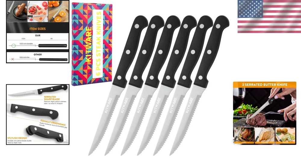 Premium Black Handle Steak Knife Set with 4.5-Inch Sharp Blades - Perfect Gift ‹ › ‹ › ‹ › ‹ › ‹ › ‹ › ‹ › ‹ › Premium Black Handle Steak Knife Set Crafted for those who appreciate the finer things in life, this exquisite set of steak knives combines exceptional quality with timeless elegance. Features: Set includes four 4.5-inch sharp blades for precise cutting. Premium ergonomic black handles designed for superior grip and comfort. High carbon stainless steel for enhanced durability and long-lasting sharpness. Elegant and sophisticated design to complement any dining occasion. Dishwasher safe for easy care and maintenance. Benefits: Effortlessly glide through steak and other meats with incredible ease. Brings a touch of sophistication to your dining table and impresses guests. Transforms ordinary meals into extraordinary culinary experiences. Perfect for both intimate family dinners and lavish celebrations. Ideal gift for weddings, anniversaries, or housewarming celebrations. Why Choose Our Premium Steak Knife Set? Every meal becomes a celebration with our Premium Black Handle Steak Knife Set. Designed with the discerning diner in mind, these knives not only exude elegance but also provide unparalleled cutting performance. Treat yourself or someone special to the ultimate dining experience and make every meal unforgettable. Your search for the perfect gift ends here. Elevate your dining experience—order your Premium Black Handle Steak Knife Set today! Shipping Free & Fast Shipping - We offer free shipping to most of the USA with a normal delivery time of 3-7 days. However, due to the current situation, additional delivery time (up to 3 weeks) may be required for some items. Alternative Carriers - We may use alternative carriers (e.g. USPS, FedEx, UPS, etc.) to ensure your package arrives safely and on time. Due to the use of multiple carriers, we are unable to provide a tracking number automatically. Handling Time - Orders are processed and shipped within 1-2 business days of receiving cleared payment. Shipping Restrictions - Shipping to Alaska, Hawaii, Puerto Rico, Guam, and other US territories may incur shipping charges or delivery restrictions. Please contact us before ordering, or your order can be refunded/cancelled. State Restrictions - There may be restrictions based on your state of purchase. For example, certain items may not be shipped to California due to state regulations. Contact for Tracking Updates - If you require tracking updates or have any concerns about the delivery of your order, please feel free to contact us, and we will be happy to assist you. Return 30-Day Hassle-Free Returns - We want you to be completely satisfied with your purchase. If you are not, you can return the item within 30 days of receiving it for a full refund or exchange. Easy Return Process - To start a return, simply contact us and we will provide you with a prepaid return shipping label and detailed instructions. Restocking Fee - There are no restocking fees for returns. However, the buyer is responsible for return shipping costs if the return is not due to a seller's error. Refund Processing Time - Refunds will be processed within 5 business days of receiving the returned item in its original condition. Payment We accept all major credit cards, PayPal, and Apple Pay for your convenience. Your payment information is secure and encrypted to ensure a safe and seamless transaction. Please complete your payment within 3 days of purchase to avoid any delays in shipping. Feedback Your feedback is extremely important to us. We strive to provide the best products and customer service possible. If you are satisfied with your purchase, please take a moment to leave us a positive review. If you have any concerns or issues with your order, please contact us before leaving negative feedback. We are committed to resolving any problems and ensuring your satisfaction. Contact Us If you have any questions or concerns, please feel free to reach out to our customer support team. You can contact us through the eBay messaging system. We are available Monday to Friday, 9:00 am to 5:00 pm EST, and we will do our best to respond to your inquiry within 24 hours. Thank you for supporting our small family business! UPC: Not Set Model: Steak Knives Set Unit Quantity: 11.36 ounces Set Includes: Steak Knife Material: Stainless Steel Food Compatibility: Meat,Bread,Butter Features: Hand Wash Only Brand: Unbranded Type: Knife Set Number of Items in Set: 6 Color: Silver Country/Region of Manufacture: Not Set MPN: Not Set Handle Material: Plastic Blade Edge: Serrated Blade Length: 5 in Making Method: Forged Manufacturer Warranty: Not Set Unit Type: oz Personalize: Not Set