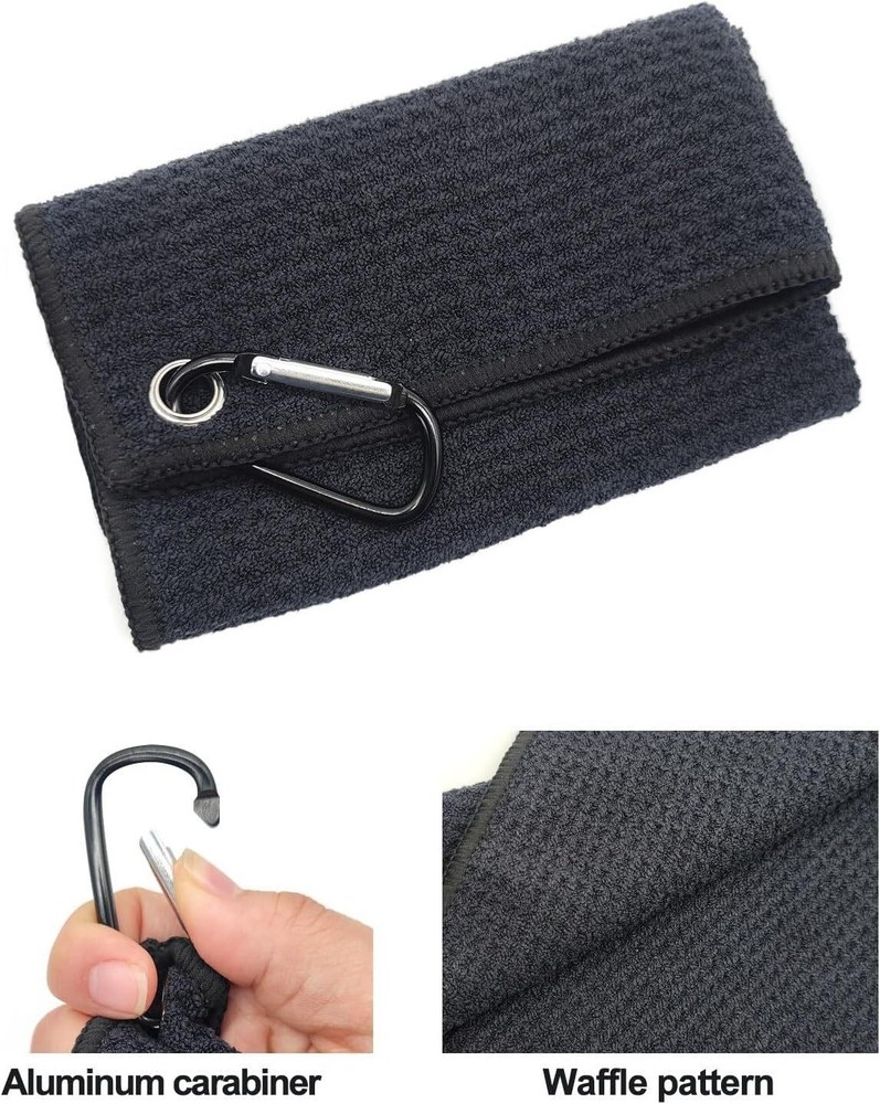Premium Golf Towel with Carabiner Clip Absorbent Microfiber Small, Black Our golf towel is well made, designed with a waffle pattern, it removes dirt, mud, sand and grass better than traditional cotton towels, ensuring efficient cleaning. Made of 80% microfiber and 20% nylon, super absorbent, easy to wash, easy to dry, strong and durable. Size: 30 x 30cm / 11.8 x 11.8inch. The aluminum carabiner is easy to use, lightweight and portable, and can be easily attached to any bag, golf trolly or belt loop and it's not in the way. Classic black is easy to match. The premium golf towel is perfect for quick and accessible cleaning of your golf clubs, putters, irons, heads, and balls during wet winter months, a perfect gift for golf enthusiasts. Packaging: 1pcs microfiber waffle pattern golf towel with carabiner. 11.8 "w x 11.8 "w. Weight: 1.44 oz Item model number -XPB78 Unit Count 1.0 Count Style Classic Product Dimensions 11.8"L x 11.8"W Number of Items 1 Pattern Solid Country of Origin China Theme Golf Item Weight 1.44 ounces Shape Rectangular Model Name -XPB78 Size Small Special Feature Lightweight Fabric Type 80% Microfiber,20% Nylon Product Care Instructions Machine Wash