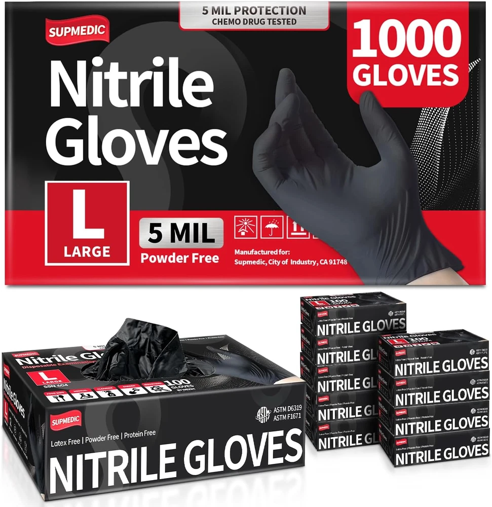 Product Description The Black Disposable Nitrile Exam Gloves are designed for both professional and personal use, offering unparalleled protection and comfort. With a thickness of 5 mil, these gloves strike a perfect balance between durability and dexterity, making them suitable for a variety of tasks. Whether you are handling food in a busy kitchen, performing medical examinations, or tackling tough cleaning jobs, these gloves provide the reliability you need. Their powder-free and latex-free composition ensures that they are safe for individuals with sensitive skin, allowing for extended wear without irritation. These gloves are not only versatile but also exceptionally strong, offering up to three times the resistance to chemicals and abrasions compared to traditional latex and vinyl gloves. This makes them an ideal choice for professional cleaners and janitors who require robust protection against harsh cleaning agents. Additionally, the sleek black color gives them a professional appearance, making them suitable for any setting—from restaurants to healthcare facilities. Experience the comfort and protection of Supmedic Nitrile Gloves for all your needs. 5 mil thickness for an optimal mix of durability and comfort 100% latex and powder-free to prevent skin irritation Exceptional chemical and puncture resistance for enhanced safety Versatile use for food preparation, medical examinations, and cleaning tasks Sleek black design offers a professional look in any setting