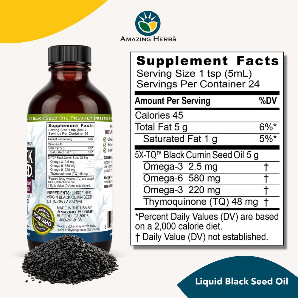 BLACK EXPERTS - Premium Black Oil Formulation Delivers Natural Oil Intended for Oral Administration, Contains Omega Fatty Acids & 5x Thymoquinone for Benefits QUALITY INGREDIENTS - Using the Highest Quality, Organically-Grown, Pesticide-Free and Non-Irradiated Nigella Sativa Seeds Containing No Preservatives or Synthetic Chemicals NATURAL BENEFITS - Black Cumin Oil Provides Immune Support, Aids in Digestive , Promotes Healthy Joints, Improves Brain Function that Restores Vitality & Improves Life Quality COLD-PRESSED IN THE USA - Utilizes Unique Screw-Type Presses that Gently Squeeze the Oil from the Seeds which Preserves the Oils Antioxidants and Retains a Higher Level of Nutrients OUR STORY - Original Manufacturers of Black & Nutritional Supplements in the World & of the First Nutraceutical Company's to Introduce it to the & Nutrition Industry in the US