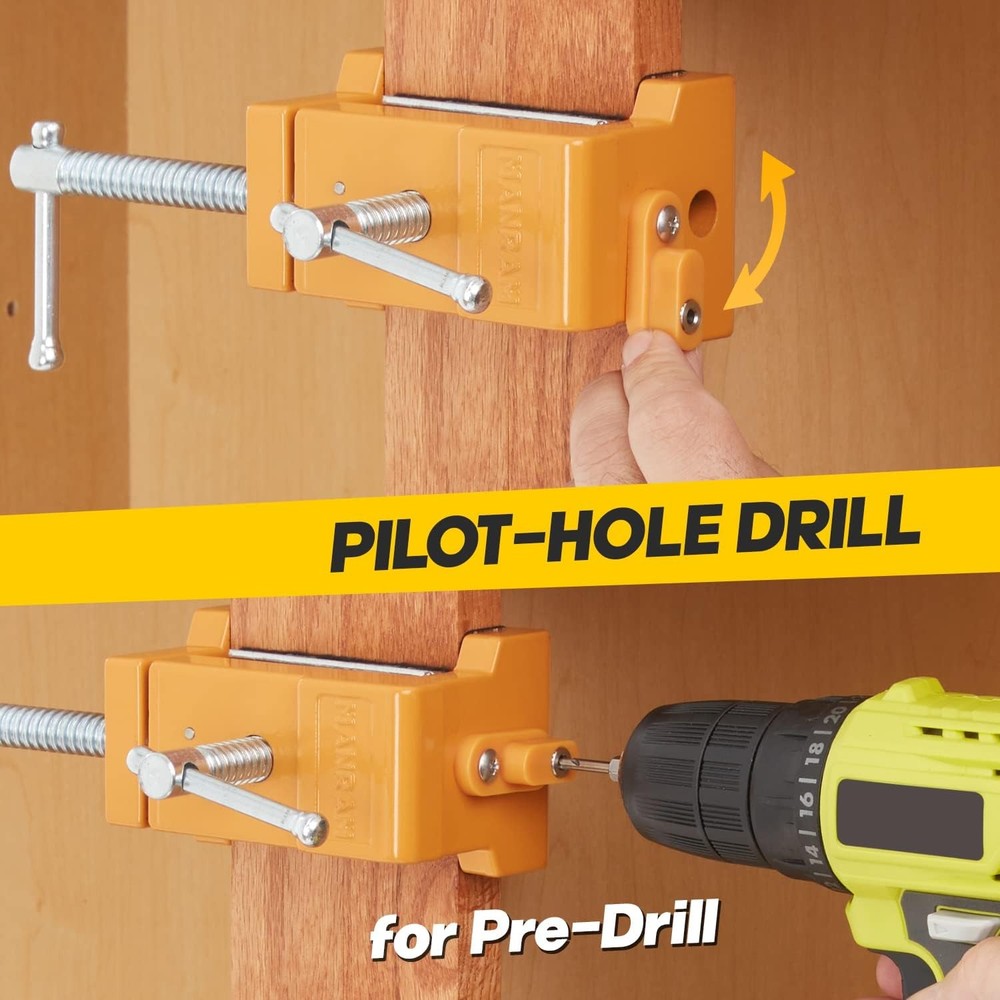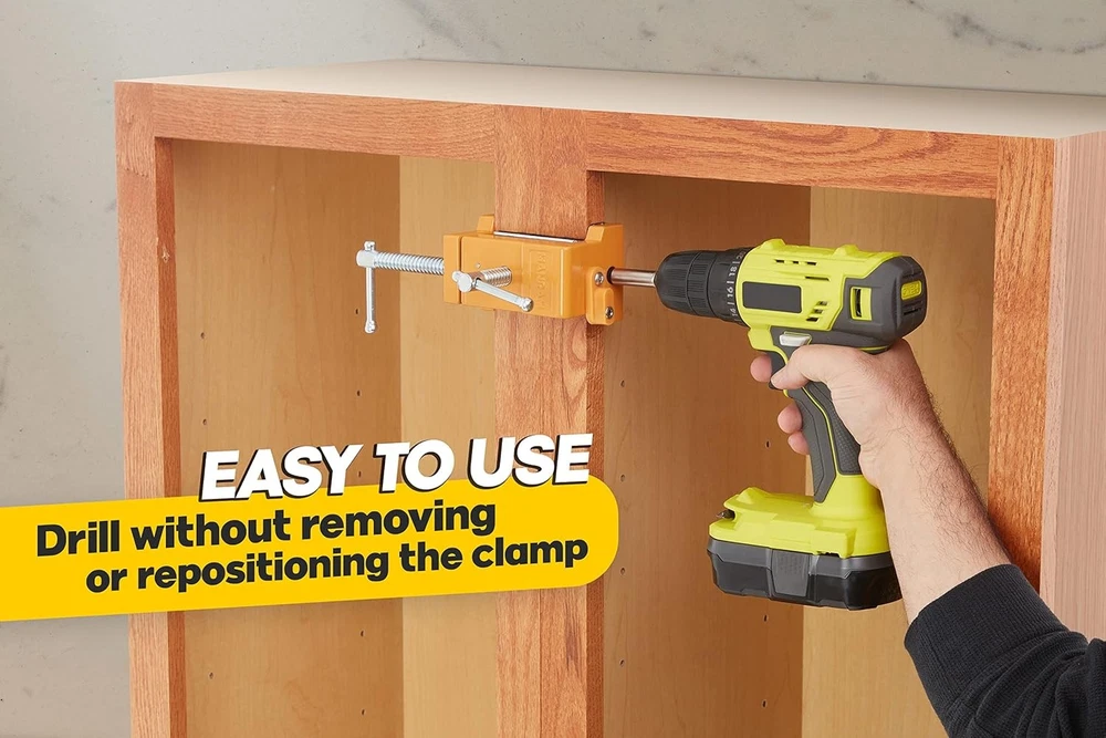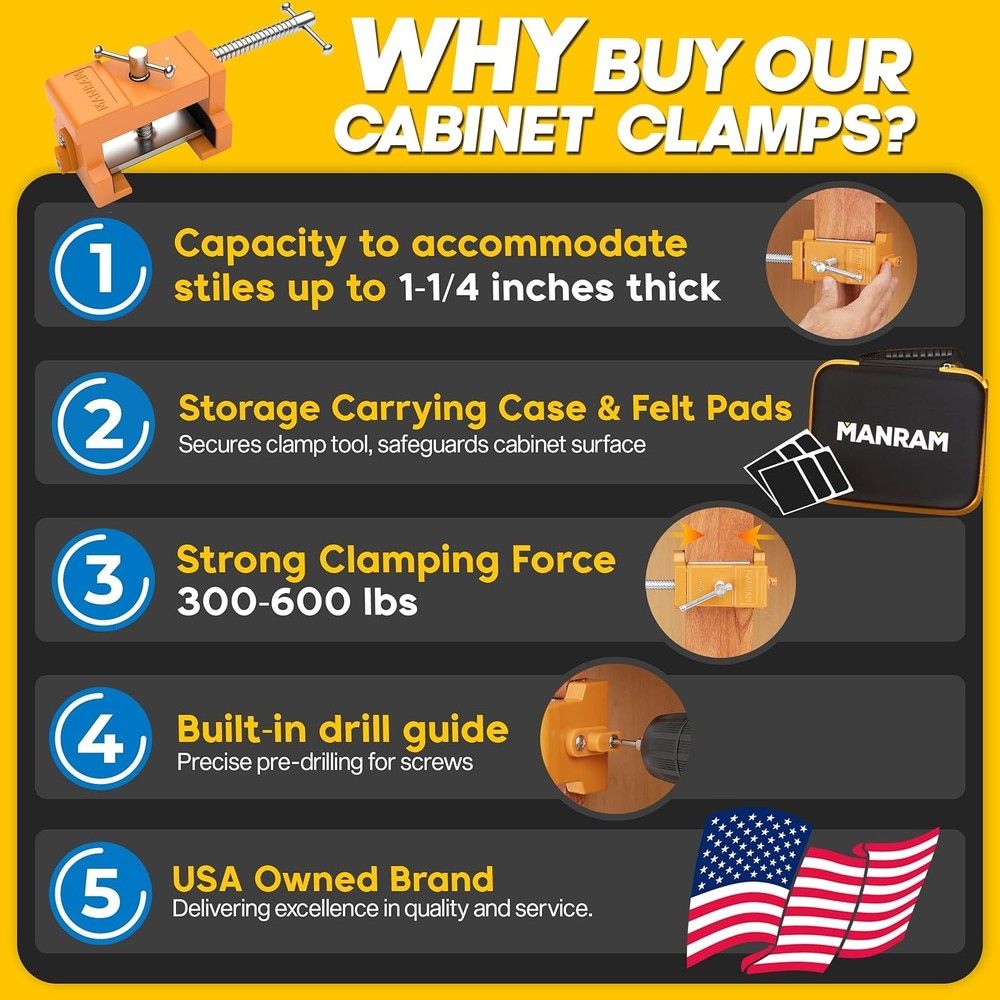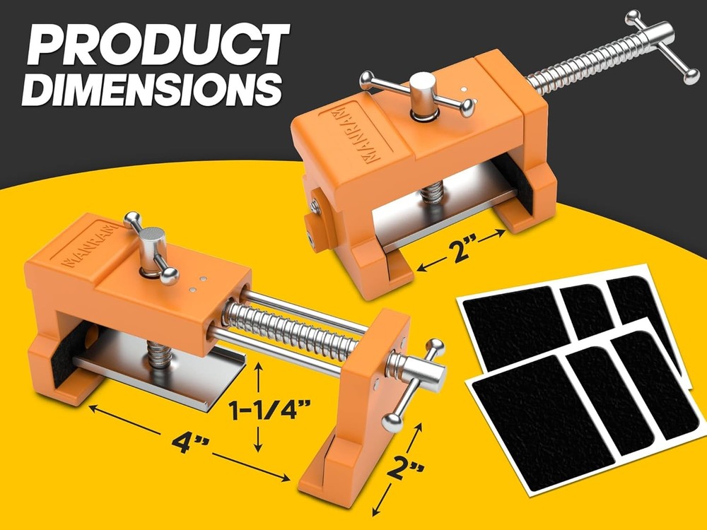 All-in-One Cabinet Clamp & Drill Guide System – These cabinet clamps for installing cabinets combine tightening, aligning, pre-drilling, and securing into one smooth step. Built-in flip-away drill guide creates perfect pilot holes without removing or repositioning the cabinet installation clamps, saving time on every install. Heavy-Duty Cabinet Installation Tools Built to Last – Made from solid cast steel with an aluminum alignment plate, these cabinet face frame clamps deliver industrial strength with 300–600 lbs of clamping force. Rust-resistant and designed for long-term use in professional cabinet making tools and woodworking tools setups. Precision Alignment for Face Frames & Doors – Designed as a reliable cabinet alignment tool, these face frame clamps ensure boards, stiles, and frames sit perfectly flush. Ideal cabinet tools for installing cabinets, bookshelves, and door projects where accuracy matters. Scratch-Free Protection with EVA Pads – Unlike standard felt pads, these cabinet installation tools feature high-density EVA padding on all contact points. Your cabinet finishes stay protected while using these cabinet clamps, door clamp, or other cabinetry tools. Complete Cabinet Tool Kit with Storage Case – Includes two (2) heavy-duty cabinet clamps, EVA protective pads, and a durable storage box. Compatible with stiles up to 1-1/4" thick and 4" clamp capacity, making this set an essential cabinet tool, tool cabinet accessory, and upgrade for any tool cabinets or workshop.