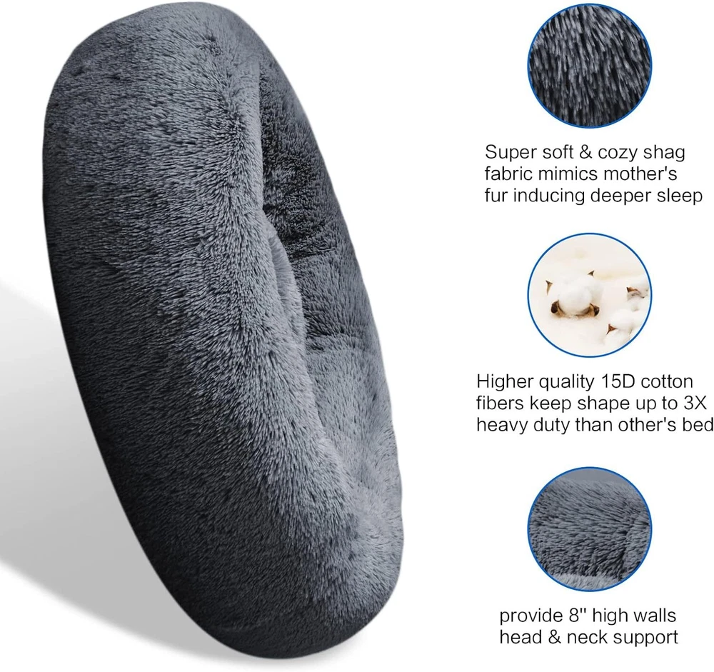 Product Description: Give your furry friend the ultimate comfort and relaxation with our Plush Donut Dog Bed. Designed to provide a cozy and secure sleeping environment, this bed is perfect for dogs and cats who love to curl up and feel safe. The soft, plush fabric and round donut shape create a calming and soothing space that helps reduce anxiety and promotes better sleep. Key Features: Ultra-Soft Material: Made from high-quality, plush fabric that is incredibly soft and comfortable, ensuring your pet feels like they're sleeping on a cloud. Anti-Anxiety Design: The round donut shape and raised edges provide a sense of security and support, helping to ease anxiety and promote relaxation. Machine Washable: Easy to clean and maintain, simply toss the entire bed into the washing machine on a gentle cycle for a fresh and hygienic bed. Non-Slip Bottom: Features a non-slip bottom to keep the bed in place on any surface, ensuring your pet's safety and comfort. Extra Large Size: Spacious enough for larger breeds or multiple smaller pets, offering ample room for stretching and lounging. Ideal For: Dogs and cats of all sizes Pets who love to curl up and feel secure Reducing anxiety and promoting better sleep How to Use: Place the Bed: Find a comfortable spot in your home where your pet likes to rest and place the bed there. Encourage Your Pet: Introduce your pet to the bed and encourage them to lie down and get comfortable. Machine Washable: When it’s time to clean, simply place the bed in the washing machine on a gentle cycle and air dry or tumble dry on low.