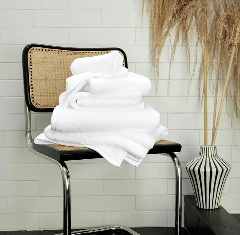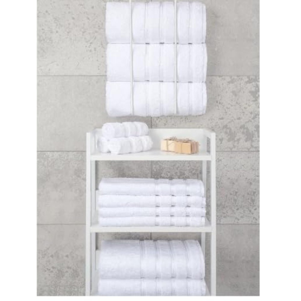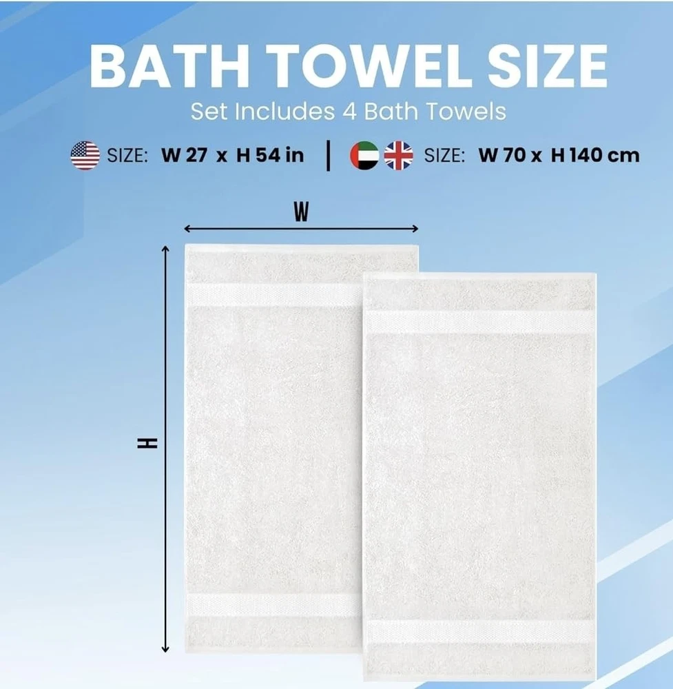 Experience hotel-quality luxury with these premium white bath towels. The set includes four generously sized towels crafted from high-quality cotton, offering exceptional absorbency and durability. Each towel features an elegant dobby border and precisely woven texture that provides both style and functionality. The plush, thick construction ensures maximum comfort while effectively drying you after a shower or bath. These towels maintain their softness and absorbency even after multiple washes, making them perfect for daily use. The classic white color adds a touch of sophistication to any bathroom decor while the reinforced edges prevent fraying, extending the life of your towels. Perfect for master bathrooms, guest rooms, or as a thoughtful housewarming gift, these towels combine practicality with luxury for an enhanced bathing experience. PREMIUM QUALITY: Set of 4 hotel-quality white bath towels made from 100% cotton for superior absorbency and durability GENEROUS SIZE: Each bath towel measures 27 x 54 inches, perfect for full-body coverage and comfortable drying LUXURIOUS TEXTURE: Professionally hemmed edges with double-stitched borders for enhanced durability and elegant appearance EASY CARE: Machine washable and dryer-safe towels that maintain their softness and absorbency wash after wash VERSATILE USE: Ideal for daily use in bathrooms, swimming pools, gyms, or as guest towels in hotels and vacation rentals