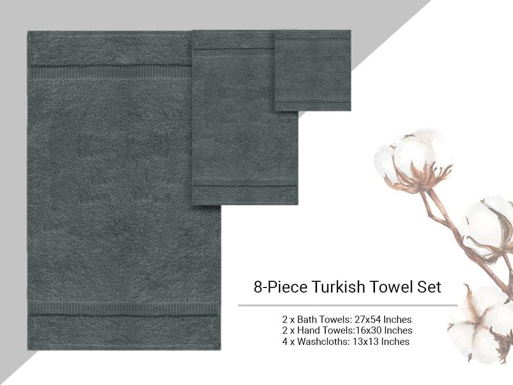 These towels are made of 100% premium cotton. Premium cotton has extra-long fibers. Using longer fiber cotton means fewer joins, which results in stronger and smoother cotton threads. Because of this unique material, Turkish towels are known to get even softer, fluffier, and more absorbent with a proper wash. With a soft touch and a range of subtle colors, our eco-friendly cotton towels are a beautiful addition to your bath SET CONTAINS: 2-piece (27’’x54’’) bath towels, 2-piece hand towels (16’’x30’’), 4-piece washcloths (13’’x13’’). LUXURY HOTEL & SPA QUALITY TOWELS: These towels are made of 100% premium cotton. Turkish towels are known to get even softer, fluffier, and more absorbent with a proper wash. Durably made with highly absorbent, natural friendly 100% premium cotton with double stitched hem for long-lasting use. CHEMICAL FREE & ECO-FRIENDLY: In our manufacturing process, we use eco-friendly materials to contribute saving our earth. CARE INSTRUCTIONS: Machine wash in cold water with mild liquid detergent without added bleach or whiteners before use. Tumble dry on low heat or hang them to dry. Please don’t use dry sheets, chemicals will only reduce the softness of the material. MADE IN TURKEY