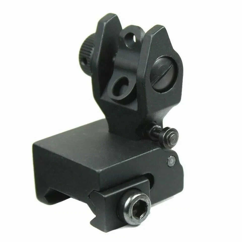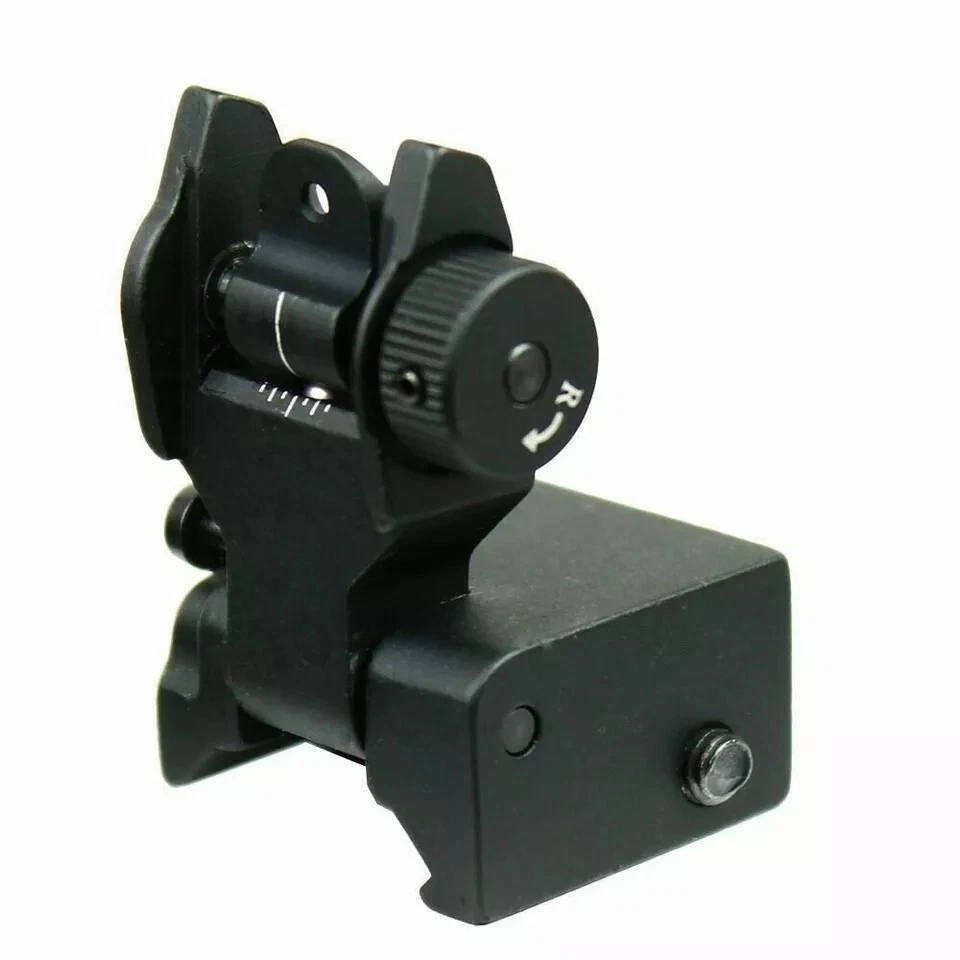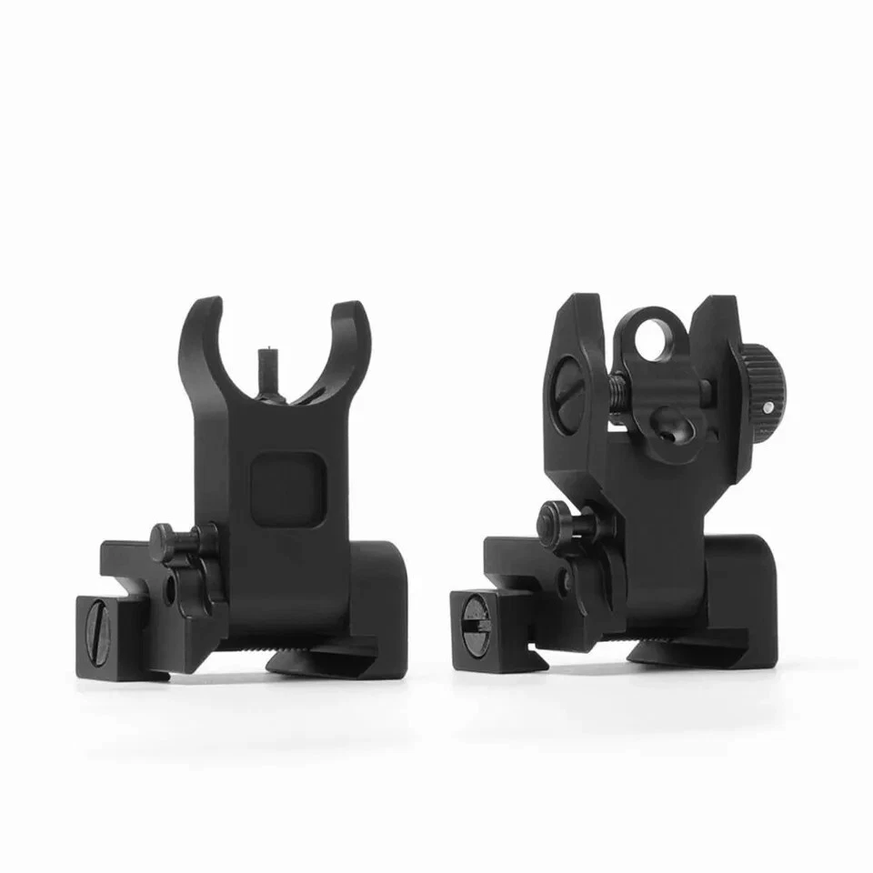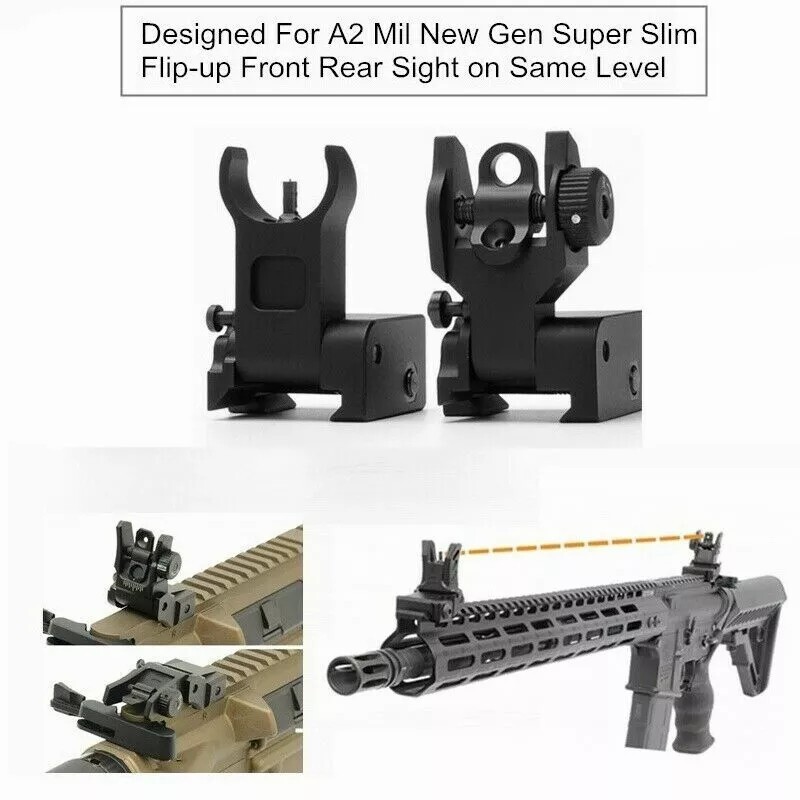 New Premium Flip up Front Rear Iron Sight Set Fits Picatinny Rails Flattop Features : Low profile folding design Dual Apertures Rear sight Windage adjustable with click knob Front sight A2 post elevation adjustable Ambidextrous Non-rust hard anodized finish Compatible with most Picatinny / Weaver rails Specifications: Color - Black anodized finish Material:6061 aircraft grade Aluminum Dimensions width: 33mm Length: 28mm (upright position) Height: 40mm (upright position) / 11mm (folded, measured from rail base) Weight:1.7 oz (front) 1.9 oz (rear) Interface:Picatinny / Weaver Rails Package : Front&Rear Iron Sight Set