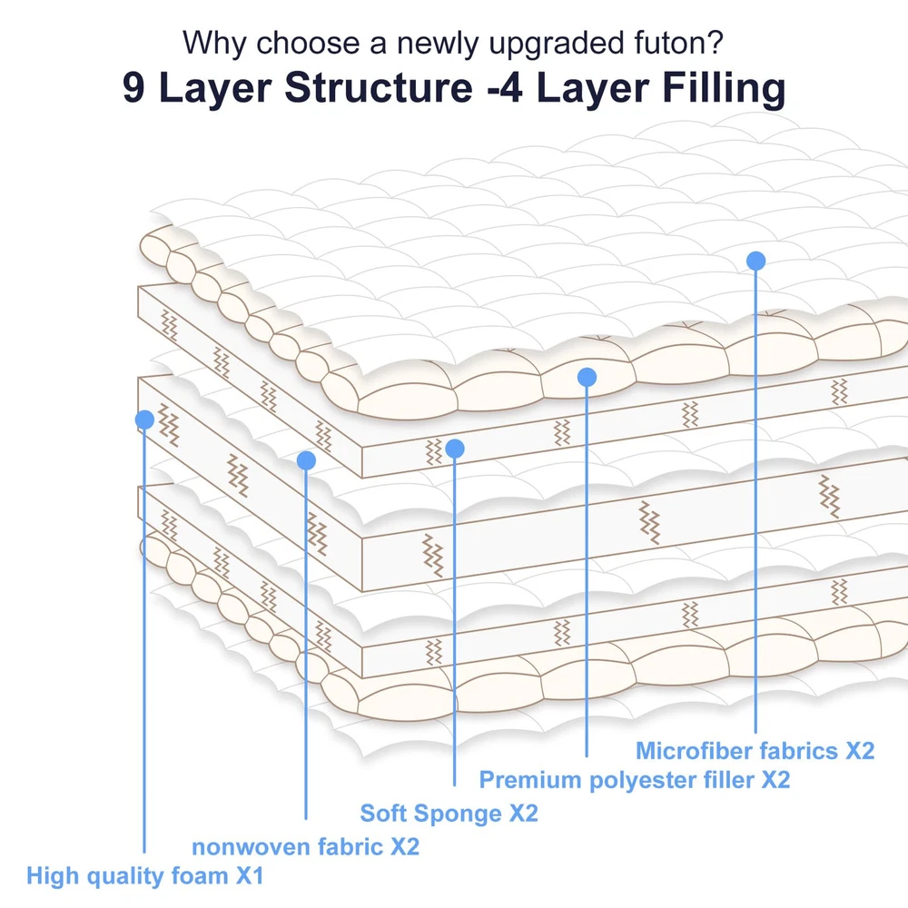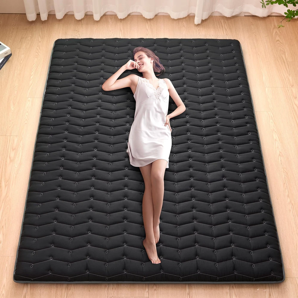 【New Upgraded Version 6 Generation 9-Layer Structure Japanese Mattress】 Thick floor mattress that helps to improve your sleep, adapts to the curve of human body structure and relieves body fatigue.9-layer structure: microfiber fabric X2 + soft sponge quilted X2 + high-density base support sponge X1 + high-grade polyester fiberfill X2 + non-woven fabric X2, designed according to the sleeping habits of modern people. This futon mattress will bring you a better sleeping experience. 【High Density Foam Reinforced Support】Adopted the new technology of Japanese mattress, made of the best premium foam, it can provide good support for the body, exclusive quilting process, no stripping, no cuts, and reinforced to prevent the edge from breaking. Reinforce the support of the outer edge of the tatami mattress, together with the extra padding, it makes the sleeping pad stronger and does not collapse even after a long time of use. 【Futon Mattress Fabric Upgrade】 - The mattress surface is made of polyester microfiber fabric for comfort, with an inner filling of polyester and high-density foundation support foam. An additional layer of padding is sewn into the mattress to soften the surface and stimulates circulation relieving body fatigue. full mattress size: 54" W x 80" L 【Versatile Uses】 This is a multifunctional futon - from bedroom/dorm futon to living room recliner, from traditional tatami to portable floor mat. It can be used as a comfortable sleep/nap mat, play mat, or even a convenient travel companion for car trips or camping trips, a good choice for a yoga mat, an alternative seating option when hosting guests ...... It's a great companion for the family to meet your various daily needs, enjoy life to the fullest now. 【Usage Instructions】After receiving the product, futon may appear wrinkles on the bedding due to compressed packaging, but this is not a defect, please wait 3 days to return to its original thickness (warm weather) to 3 weeks (cold weather) to allow the product to fully expand. NOTE: To prevent damage to bedding, please use a comforter cover or sheet!