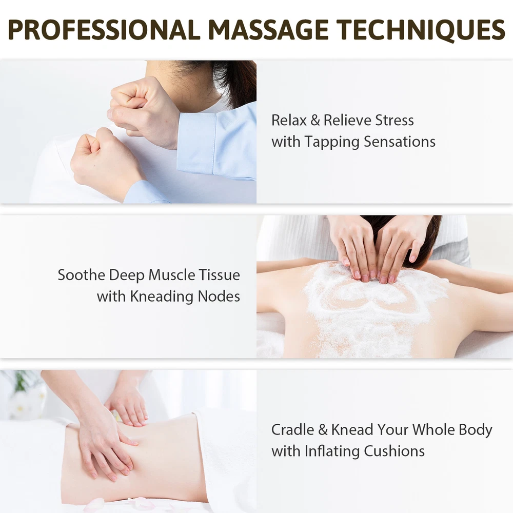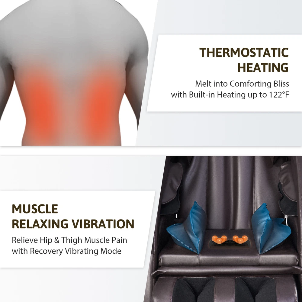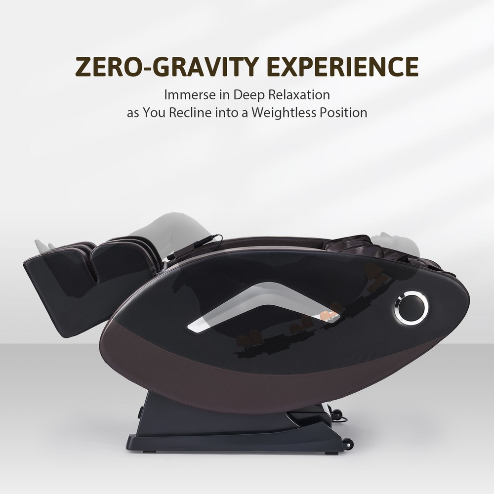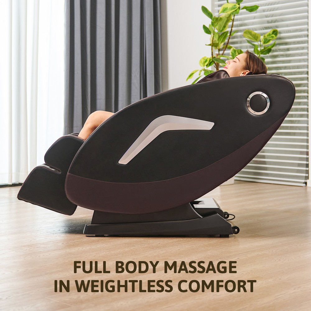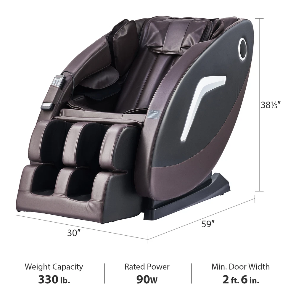NOTE Because of the size and weight of this product, it will ship in 2 separate packages which may arrive at different times. DESCRIPTION This multifunctional massage chair provides unrivaled comfort for your relaxation needs. Our full-body massage chair’s 22 nodes generate kneading power while multiple inflating air cushions cradle and squeeze your arms, shoulders, hips, and calves to quickly get rid of all your tension and stress. This massager targets your shoulders, back, legs, and feet, restoring your vitality with 15 to 30 minutes of vibration, pressure, and kneading. The lower back heating system releases tightened knots to provide long lasting relief. The footrest adjusts by 4.3 inches to accommodate all your family members. This 8D massage chair's zero gravity mode will bring your experience to another level by allowing you to slide into a weightless position that decompresses your spinal vertebrae and relaxes your muscles. The built-in Bluetooth speakers let you play music, audiobooks, or podcasts while getting massaged. This chair’s various massage patterns and intensity levels suit your particular needs, and the remote control makes it easy to control. FEATURES ERGONOMIC 8D CHAIR This 8D massage chair uses 22 kneading nodes and multiple inflating cushions to generate massaging and squeezing power that relieves stress and tension from head to toe. ZERO-GRAVITY RECLINE This all in one full body massager gently elevates your feet to the same level as your heart and reclines into a weightless position where you can feel back pain relieved. COMPLETE RELAXATION Heating pads in the lumbar area add warmth to loosen knots and reduce tension; use our Bluetooth system to listen to calming music, sounds from nature, and more DURABLE CONSTRUCTION This circulation booster's sturdy metal frame supports up to 330 pounds ; the foam padding inside the plush, ultra-soft faux-leather ensures lasting comfort; do take care, however, that your doorways are at least 30 inches wide to accommodate this spacious chair TOTAL CONTROL At the push of a button, the intuitive corded controller customizes your massage mode, position, intensity, speed, and heat to give you just the right pressure in just the right spot SPECIFICATION Material: Faux Leather, ABS, Nylon , Carbon Steel, Copper Color: Brown Input: 110V/60Hz Rated Power: 90W Dimensions: 59 x 29.5 x 38.2 in. (150x75x97cm) Head Rest Width: 9.8 in. (25 cm) Leg Rest Width: 5.9 in. (15 cm) ea. Weight Capacity: 330 lb. (150 kg) Package Weight: 85 & 33 lb. (39 & 15 kg) Min. Door Width: 30 in. (75 cm) PACKAGE LIST 1 x Massage Chair 1 x Instruction Manual