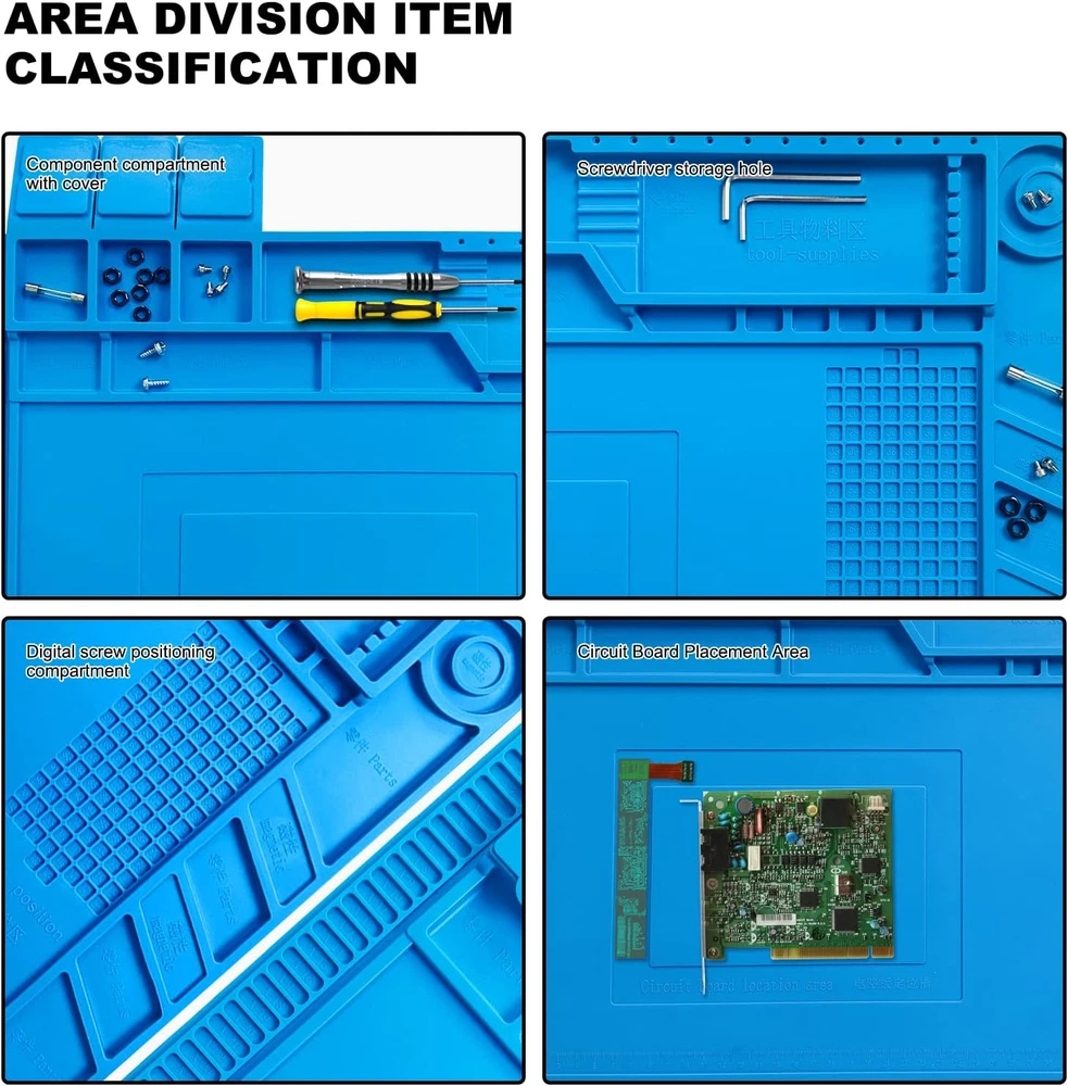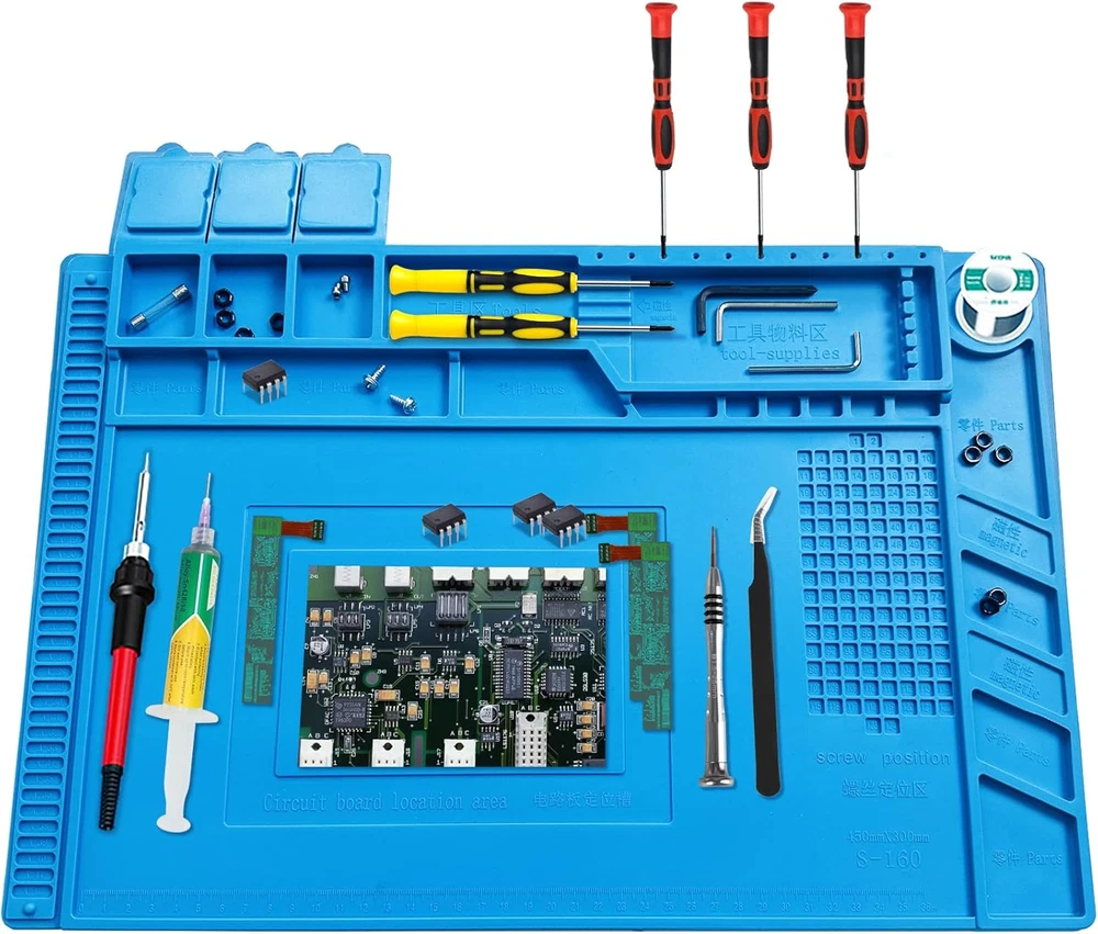 Silicone 【HEAT AND ANTI-STATIC 】 Solder pad can resist high temperature 932°F(500°C), at the same time has good heat dissipation and anti-static function, in the protection of your workbench will not be damaged at the same time can protect your line components will not be damaged 【LARGE SIZE AND MULTI-FUNCTION 】 17.7*11.8 Large size design, welding pad can provide a larger work space, to meet your multiple projects at the same time, multi-area design, make your maintenance more convenient 【HIGH QUALITY MATERIAL】 Silicone welding pad adopts high quality silicone material, high temperature resistance, anti-static, flame retardant, non-slip, no odor, no deformation, while working can also give you a comfortable working environment 【WIDE RANGE OF APPLICATION 】 Large solder pad is the ideal repair platform for laptop computers, mobile phones, cameras, electronic watches, electronic toys and other electronic products, can also be used for electric soldering iron, heat gun electronic welding. 【AFTER-SALES AND COMMITMENT】 This solder mat is specially designed for table welding, is the best gift for friends and family, if you have any questions, feel free to contact us, we will reply to you within 24 hours, I wish you a happy life Product Description Workbench pad, whether you are an electronic repair worker, or do manual, this soldering pad is a good choice for you Workbench pad, whether you are an electronic repair worker, or do manual, this soldering pad is a good choice for you Organize and Simplify : With its multi-functionality and practical features, this repair mat helps you stay organized and makes your repair work a breeze. No more searching for tiny screws or struggling to keep track of different parts. It's time to improve your work efficiency and enjoy a clean and tidy maintenance platform. Safety First : The heat insulation properties of this soldering station magnetic mat ensure your platform is protected from the high temperatures involved in soldering work. Focus on your project without the worry of damaging your workspace. Professional Grade : Whether you're a professional technician or a DIY enthusiast, this silicone repair mat is designed to meet your needs. Its quality construction and thoughtful design make it a reliable tool for a wide range of electronic repairs. Stay in Place: The anti-slip design on both surfaces of the mat ensures it stays securely in place, providing a stable work surface. No more slipping or sliding around on your desk, allowing you to work with confidence. Versatile and Practical : This electronics work mat is not limited to soldering work only. It can be used for various repair tasks, making it a versatile addition to your toolkit. From cellphones to eyeglasses, this mat has got you covered. High quality silicone material High temperature resistant Can withstand 500 degrees high temperature, to protect the maintenance table, not blown by high temperature Also has the characteristics of gathering heat, heat gathered on the pad, blowing welding CPU is also faster Resistant to oil and water If the mat is accidentally stained with oil, water and other liquids, will not penetrate the mat, just use a dry cloth or absorbent paper towels a wipe will be clean Not afraid of glue, such as AB glue, instant glue, etc., put the glue on the mat, wait for the glue to dry, gently tear on it Anti-deformation Using high-density silicone material, thickened, very elastic, anti-pull, bend at will, anti-static, soft toughness, with automatic recovery structure One solder pad, 9 core functions High temperature resistance up to 500 degrees, large working area, 1/3 larger than the traditional pad With motherboard snap area, no need to worry about the motherboard moving when working, while with screw digital positioning grid, easy to summarize With magnetic tool compartment, convenient for magnetization of tools and adsorption of parts Screwdriver hole more convenient for your tools storage, selected high-quality silicone, high temperature resistance, no odor Workbench pad with a scale to help you work, while the pad can be rolled up and folded, easy to carry without deformation Efficiency at its Best: Say goodbye to the time-consuming task of sorting and classifying small parts. With the easy-to-use part boxes and screws positions on this mat, you can quickly locate what you need, saving you valuable time during your repair projects. Protect Your Workspace : Worried about damaging your desk or work station during repairs? This magnetic silicone repair mat acts as a protective barrier, ensuring your platform remains safe from scratches, burns, and spills. Compact and Lightweight: Despite its impressive features, this repair mat is designed to be portable and easy to carry. Take it with you wherever you go and have a reliable workspace at your fingertips.
