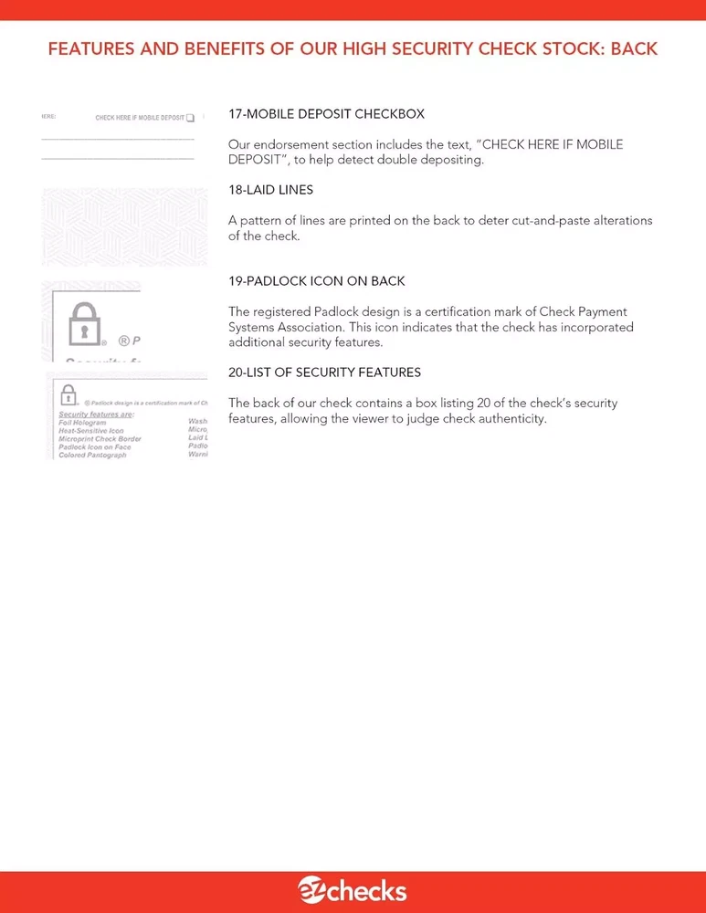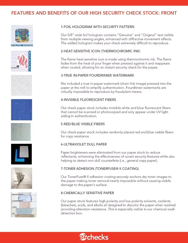 Premium High-Security Check Paper with Hologram & 22 Security Features (Check at Top) Free Shipping! Choose Your Quantity: 25 Pack 50 Pack 100 Pack 200 Pack Higher quantities available upon request. Choose Color: Blue Brown/Yellow - TAN Green Purple Description: Features: This high-security check paper contains 22 security features, including a foil hologram, prismatic multi-color background, heat-sensitive icon, and Fourdrinier watermark. High-security checks provide exceptional security by combining in-paper and on-paper elements. This pantograph paper is letter size, with the check on top to help protect your business from check fraud. Letter size (8.5" x 11"); check on top; double perforations (at 3.5" and 7"); Custom-designed color pantograph for a clean, professional look. White check stubs. Premium, high-quality check paper is ideal for business, accounts payable, payroll, and personal checks. It is compatible with laser and inkjet printers, popular check printing software, and programs like QuickBooks and Sage. Product Details: Manufacturer: EZ Checks Item model number: Parent-Stock_HS-Laser-Checks Material Type: Paper Size: Check at the Top Manufacturer Part Number: Parent-Stock_HS-Laser-Checks High Security Check Paper TOP Position: Blue: RC 490 HS TAN: RC 490 HS-T (Name updated from brown/yellow to TAN) Green: RC 490 HS-G Purple: RC 490 HS-P We carry Middle and Bottom position Check Paper upon request: High Security Check Paper Blue - Middle Position RC 590 HS High Security Check Paper Tan - Middle Position RC 590 HS-T High Security Check Paper Green - Middle Position RC 590 HS-G High Security Check Paper Purple Middle Position RC 590 HS-P --- High Security Check Paper Blue - Bottom Position RC 390 HS High Security Check Paper Tan - Bottom Position RC 390 HS-T High Security Check Paper Green - Bottom Position RC 390 HS-G High Security Check Paper Purple - Bottom Position RC 390 HS-P Quantities available from 500-10,000, unless otherwise noted, or listed. Custom check printing available upon request for an additional fee for any quantity. Contact us for more information. Our Policy: We strive to provide a positive experience for all our customers. We're dedicated to delivering high-quality products and exceptional service. Your satisfaction is our top priority, and we will work diligently to address any concerns you may have regarding your purchase. Your satisfaction is guaranteed. If you have any questions or need assistance regarding your purchase, please don't hesitate to contact us through eBay messaging.