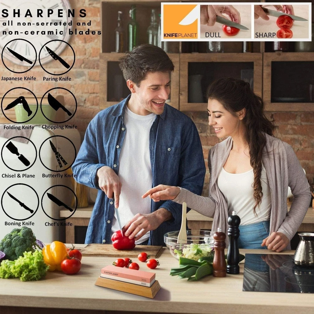 Premium Knife Sharpening Stone Set – 400/1000 and 3000/8000-Grit Professional, Safe Knife Sharpener Set – Whetstone Set Includes Flattening Stone, Bamboo Base, and 2 Nonslip Rubber Bases