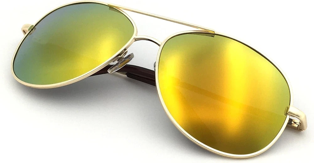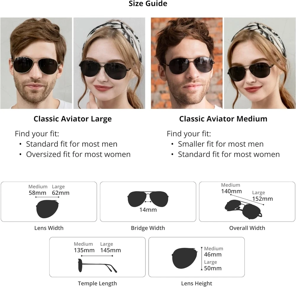 Premium Military Style Classic Aviator Sunglasses, Polarized, 100% UV protection for Men Women [Polarized lens] - Specialized multi-layer lens designed to filter and block over of glare - Polarized lenses block out intense horizontal reflections (glare) by having a vertically oriented filter layer embedded in the lens, providing maximum comfort and improved visibility. These lenses are tough, lightweight, scratch resistant, and have high optical clarity (distortion-free, clear vision), making them an excellent choice for general outdoor and water sports activities. [Ultraviolet light protection] - All lenses are UV400 rated, which can block 99%- 100% of UVA and UVB radiation. UV400-rated sunglasses are essential to protecting your eyes against long-term UV light damage and keeping your eyes healthy when out and about. [Duroframe metallic alloy frame] - Made with ultra-lightweight yet strong and durable Duroframe Metallic Alloy. It comes with spring-loaded hinged legs and adjustable silicon nose pads, allowing maximum comfort and flexibility. [Perfect all-rounder] - Being polarized and having 400UV protection makes these sunglasses the ideal choice for outdoor sports and activities such as driving, fishing, skiing, traveling, hiking, and boating. They are suitable as a high-fashion accessory and daily wear all round. They are also gift-packaged ready, making them an excellent yet practical gift idea for friends and family! [100% risk-free purchase] - All Sunglasses come with a 1- satisfaction on frames and lenses and a 30 Day Happiness SATISFACTION GUARANTEE. So, if you are not completely happy with your purchase for whatever reason, let us know, and we'll take care of you. Premium Military Style Classic Aviator Sunglasses Polarized and 100% UV protection - protect your eyes without compromising on style, comfort and safety. Polarized and 100% UV protection sunglasses help: - Reduce eyestrain, no tired eyes after a full day in the sun. - Reduce reflections and glare (especially important for those with sensitive eyes or post-surgery recovery) - Protect your eyes against harmful UV rays, minimizing damage to your eyesight in the long run. - Improve contrast and visual clarity Measurements: - Overall Width: 152mm (Large) / 140mm (Medium) - Lens Width: 62mm (Large) / 58mm (Medium) - Lens Height: 50mm (Large) / 46mm (Medium) - Temple Length: 130mm - Bridge Width: 14mm Large (62mm): Suitable for average - large male, or female for a oversized fit Medium (52mm): Suitable for the average male, or female Here are 5 reasons you're going to love your Military Style Classic Aviators: 1. It blocks 99-100% of both UVA and UVB harmful radiation 2. It has a special polarized filter to block over of glare 3. Classic unisex design (So you can protect your eyes while looking stylish) 4. Made of lightweight yet durable metallic alloy with spring-loaded hinges ensuring maximum comfort. 5. Backed by a happiness SATISFACTION GUARANTEE and a 1- Order yours now because you risk nothing! Bonus: All sunglasses come gift packaged ready, making these sunglasses an excellent yet practical gift idea for your active friends and family! Order your Premium Military Style Classic Aviator Sunglasses and join thousands of other satisfied customers who love the difference!