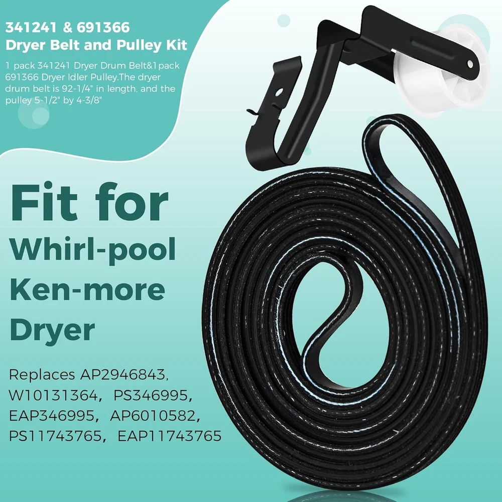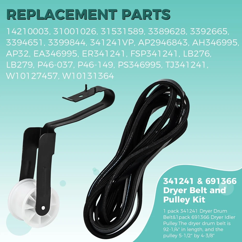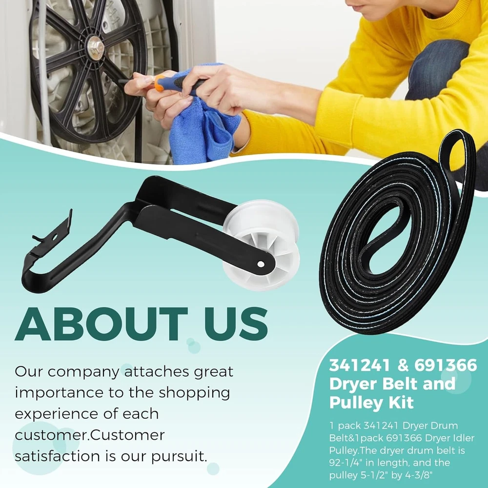 Premium Quality Dryer Drum Belt and Idler Pulley Kit for Easy Home Repairs ‹ › ‹ › ‹ › ‹ › ‹ › ‹ › ‹ › ‹ › ‹ › Premium Quality Dryer Drum Belt and Idler Pulley Kit Ensure your dryer operates at its best with this easy home repair solution. Our complete kit includes: 1 pack of 341241 Dryer Drum Belt (Length: 92-1/4") 1 pack of 691366 Dryer Idler Pulley (Dimensions: 5-1/2" x 4-3/8") Key Replacement Parts: This kit replaces several OEM parts, including: 14210003 31001026 31531589 3389628 3392665 341241VP And many more... Repair Symptoms: This kit addresses common dryer issues, including: Dryer belt breaks or wears out Dryer does not roll or start Dryer does not heat or heats insufficiently Unusual and loud noises Long drying times Burning smell Easy Installation: With our user-friendly design, you can perform this repair quickly and effortlessly. Save money on appliance repairs by taking matters into your own hands. Note: Remember to disconnect the power supply before installation and wear gloves to safeguard your hands. Premium Quality Assurance: Every component of our kit is made from durable materials and is well-tested to meet or exceed OEM standards, ensuring exceptional performance and longevity. Our Commitment: Your satisfaction is our top priority. We are dedicated to providing an exemplary shopping experience and support should you have any questions or concerns. Why Choose Our Kit? Eliminate the hassle of an ineffective dryer with our comprehensive repair kit. It’s the ideal solution to restore your appliance's dependability, ensuring your laundry days remain a breeze. Choose our Premium Quality Dryer Drum Belt and Idler Pulley Kit for reliable performance you can trust. Shipping Free & Fast Shipping - We offer free shipping to most of the USA with a normal delivery time of 3-7 days. However, due to the current situation, additional delivery time (up to 3 weeks) may be required for some items. Alternative Carriers - We may use alternative carriers (e.g. USPS, FedEx, UPS, etc.) to ensure your package arrives safely and on time. Due to the use of multiple carriers, we are unable to provide a tracking number automatically. Handling Time - Orders are processed and shipped within 1-2 business days of receiving cleared payment. Shipping Restrictions - Shipping to Alaska, Hawaii, Puerto Rico, Guam, and other US territories may incur shipping charges or delivery restrictions. Please contact us before ordering, or your order can be refunded/cancelled. State Restrictions - There may be restrictions based on your state of purchase. For example, certain items may not be shipped to California due to state regulations. Contact for Tracking Updates - If you require tracking updates or have any concerns about the delivery of your order, please feel free to contact us, and we will be happy to assist you. Return 30-Day Hassle-Free Returns - We want you to be completely satisfied with your purchase. If you are not, you can return the item within 30 days of receiving it for a full refund or exchange. Easy Return Process - To start a return, simply contact us and we will provide you with a prepaid return shipping label and detailed instructions. Restocking Fee - There are no restocking fees for returns. However, the buyer is responsible for return shipping costs if the return is not due to a seller's error. Refund Processing Time - Refunds will be processed within 5 business days of receiving the returned item in its original condition. Payment We accept all major credit cards, PayPal, and Apple Pay for your convenience. Your payment information is secure and encrypted to ensure a safe and seamless transaction. Please complete your payment within 3 days of purchase to avoid any delays in shipping. Feedback Your feedback is extremely important to us. We strive to provide the best products and customer service possible. If you are satisfied with your purchase, please take a moment to leave us a positive review. If you have any concerns or issues with your order, please contact us before leaving negative feedback. We are committed to resolving any problems and ensuring your satisfaction. Contact Us If you have any questions or concerns, please feel free to reach out to our customer support team. You can contact us through the eBay messaging system. We are available Monday to Friday, 9:00 am to 5:00 pm EST, and we will do our best to respond to your inquiry within 24 hours. Buy it now and enjoy a pleasant shopping experience! UPC: Not Set Item Weight: 6.2 ounces Unit Quantity: 1 Set Includes: Belt,341241 Dryer Drum Belt,691366 Dryer Idler Pulley Suitable For: Vented Dryer,Whirlpool Dryer,Kenmore Dryer Compatible Model: Whirlpool Features: Easy Installation,Premium Quality,Durable Material,Easy to install,Long-lasting performance,Compatible with various models,Well-tested by manufacturer,Meets OEM standards Brand: Unbranded Type: Belt Power Source: Electric Color: Multicolor Model: Not Set Installation: Freestanding Capacity: Less Than 5 lb Compatible Brand: Not Set MPN: Not Set Number of Items in Set: 2 Material: Rubber Finish: Matte Country/Region of Manufacture: Not Set Item Height: Not Set Item Width: Not Set Item Depth: 1-5 in Manufacturer Warranty: Not Set Power: 400 W or less Unit Type: oz