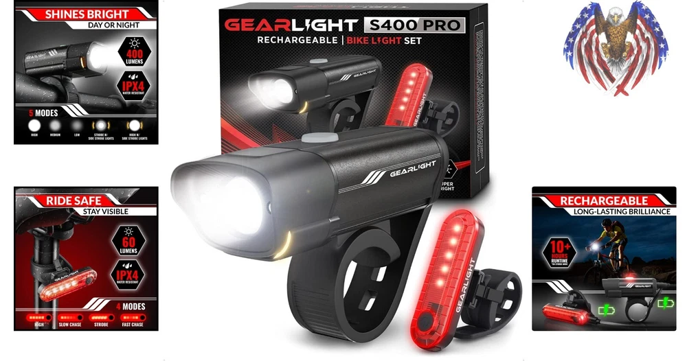 Suggested Users: Unisex-adult Item Height: Bike Lights Features: Water Resistant, Rechargeable Batteries, USB, Rechargeable, Long-Lasting Performance, Multiple Lighting Modes, Easy to Install, Weather Resistant, Durable, Amberside Lights, Wide-Angle Beam Mounting Type: Quick Universal Mount Item Length: Bike Lights gtin13: Does Not Apply International Protection Rating: Ipx4 Brand: Unbranded Auto Part Position: Front Material: Plastic, Aluminum Sport Type: Cycling Package Weight: 0.19 Kilograms Brightness: 400 Lumen Color: Black Water Resistance Level: Waterproof Bulb Type: LED Power Source: Battery Powered Number Of Settings: 5 Style: Front And Back UPC: Does Not Apply Item Package Dimensions L X W X H: 6.14 X 4.65 X 1.65 Inches Item Weight: 0.19 kg Type: Head & Tail Light Set Model: Bike Lights