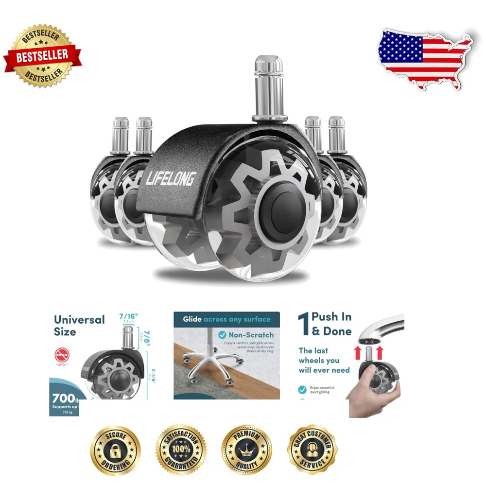 Premium Rubber Chair Casters - Safe for Hardwood and Carpet Floors, Set of 5 ‹ › ‹ › ‹ › ‹ › ‹ › ‹ › ‹ › ‹ › Premium Rubber Chair Casters - Set of 5 The Last Office Chair Wheels You'll Need Features: Heavy-duty construction with industrial-grade steel, precision ball bearings, and durable polyurethane material. Compatible with most office chairs (not compatible with IKEA chairs) - stem size: 7/16" x 7/8". Will not scratch, smudge or damage hardwood, laminate, vinyl, tile, or carpet floors. Smooth rolling action with a load capacity of up to 700 lbs. Quiet operation ensures you glide silently across your workspace. Benefits: Eliminate the need for desk chair mats with safe floor gliding. Heavy-duty design ensures longevity and resilience against wear and tear. Reliable mobility solution for home office or corporate environments. Perfect for various flooring surfaces; glide effortlessly without damaging your floors. Easy installation and replacement for most office chairs. Why Choose Our Premium Rubber Chair Casters? Transform your workspace with our Premium Rubber Chair Casters - the ultimate solution for anyone seeking durability, sleek design, and reliable performance. With industrial-grade materials, these heavy-duty casters glide seamlessly over any surface, maintaining the integrity of your floors while keeping your office chair as mobile as you need it to be. No more concerns about the noise and damage caused by standard wheels. Our casters provide a smooth and quiet experience, handling weights up to 700 lbs, making them suitable for every workspace scenario. Elevate your office experience and invest in a set of chair wheels that will stand the test of time. Order your set today and experience a difference in gliding comfort and floor safety! Shipping Free & Fast Shipping - We offer free shipping to most of the USA with a normal delivery time of 3-7 days. However, due to the current situation, additional delivery time (up to 3 weeks) may be required for some items. Alternative Carriers - We may use alternative carriers (e.g. USPS, FedEx, UPS, etc.) to ensure your package arrives safely and on time. Due to the use of multiple carriers, we are unable to provide a tracking number automatically. Handling Time - Orders are processed and shipped within 1-2 business days of receiving cleared payment. Shipping Restrictions - Shipping to Alaska, Hawaii, Puerto Rico, Guam, and other US territories may incur shipping charges or delivery restrictions. Please contact us before ordering, or your order can be refunded/cancelled. State Restrictions - There may be restrictions based on your state of purchase. For example, certain items may not be shipped to California due to state regulations. Contact for Tracking Updates - If you require tracking updates or have any concerns about the delivery of your order, please feel free to contact us, and we will be happy to assist you. Return 30-Day Hassle-Free Returns - We want you to be completely satisfied with your purchase. If you are not, you can return the item within 30 days of receiving it for a full refund or exchange. Easy Return Process - To start a return, simply contact us and we will provide you with a prepaid return shipping label and detailed instructions. Restocking Fee - There are no restocking fees for returns. However, the buyer is responsible for return shipping costs if the return is not due to a seller's error. Refund Processing Time - Refunds will be processed within 5 business days of receiving the returned item in its original condition. Payment We accept all major credit cards, PayPal, and Apple Pay for your convenience. Your payment information is secure and encrypted to ensure a safe and seamless transaction. Please complete your payment within 3 days of purchase to avoid any delays in shipping. Feedback Your feedback is extremely important to us. We strive to provide the best products and customer service possible. If you are satisfied with your purchase, please take a moment to leave us a positive review. If you have any concerns or issues with your order, please contact us before leaving negative feedback. We are committed to resolving any problems and ensuring your satisfaction. Contact Us If you have any questions or concerns, please feel free to reach out to our customer support team. You can contact us through the eBay messaging system. We are available Monday to Friday, 9:00 am to 5:00 pm EST, and we will do our best to respond to your inquiry within 24 hours. Buy it now and enjoy a pleasant shopping experience! UPC: Not Set Model: Not Set MPN: Not Set Unit Quantity: 2 Brand: Unbranded Country/Region of Manufacture: Not Set Unit Type: Not Set